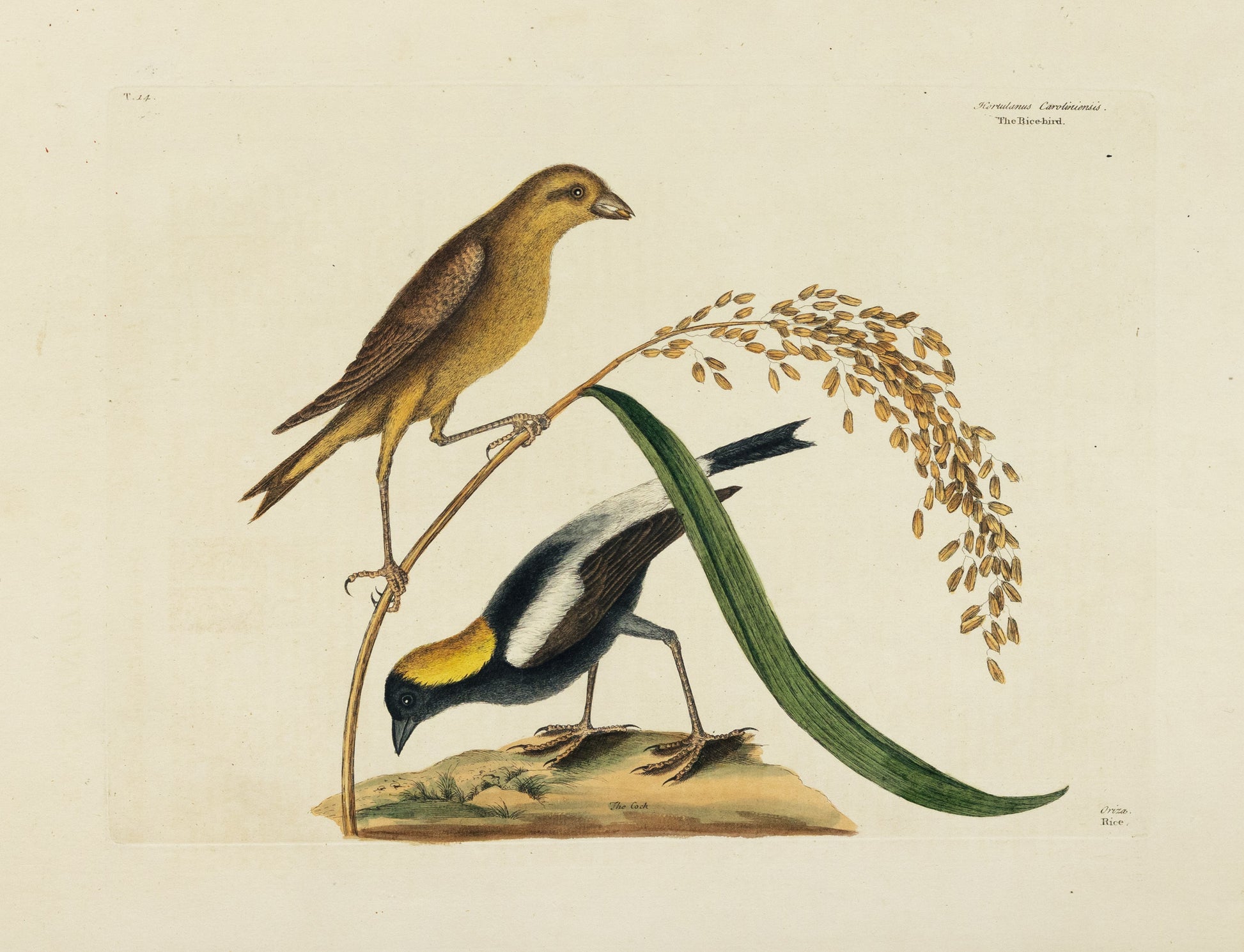 Currently known as the bobolink, Dolichonyx oryzivorus and rice, Oryza sativa*, Catesby described these subjects as follows: