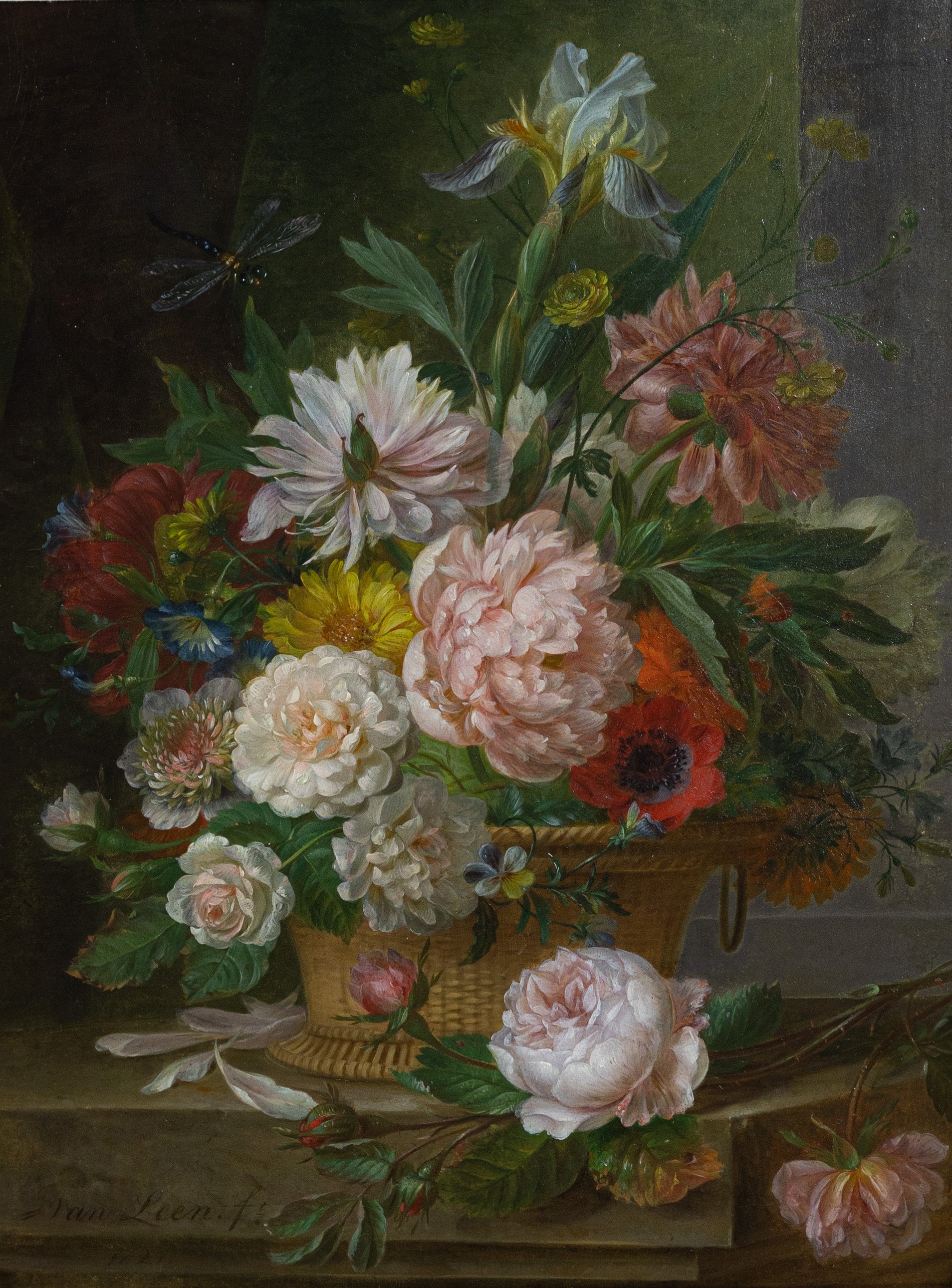 In this small and engaging composition, van Leen embellishes the classic botanical still-life composition with the addition of a small dragon-fly. Van Leen’s Still-Life with Roses... is a fine and delicate painting by a master flower painter. Van Leen’s paintings are in the collections of the Metropolitan Museum of Art in New York and the Fitzwilliam Museum, Cambridge, England.