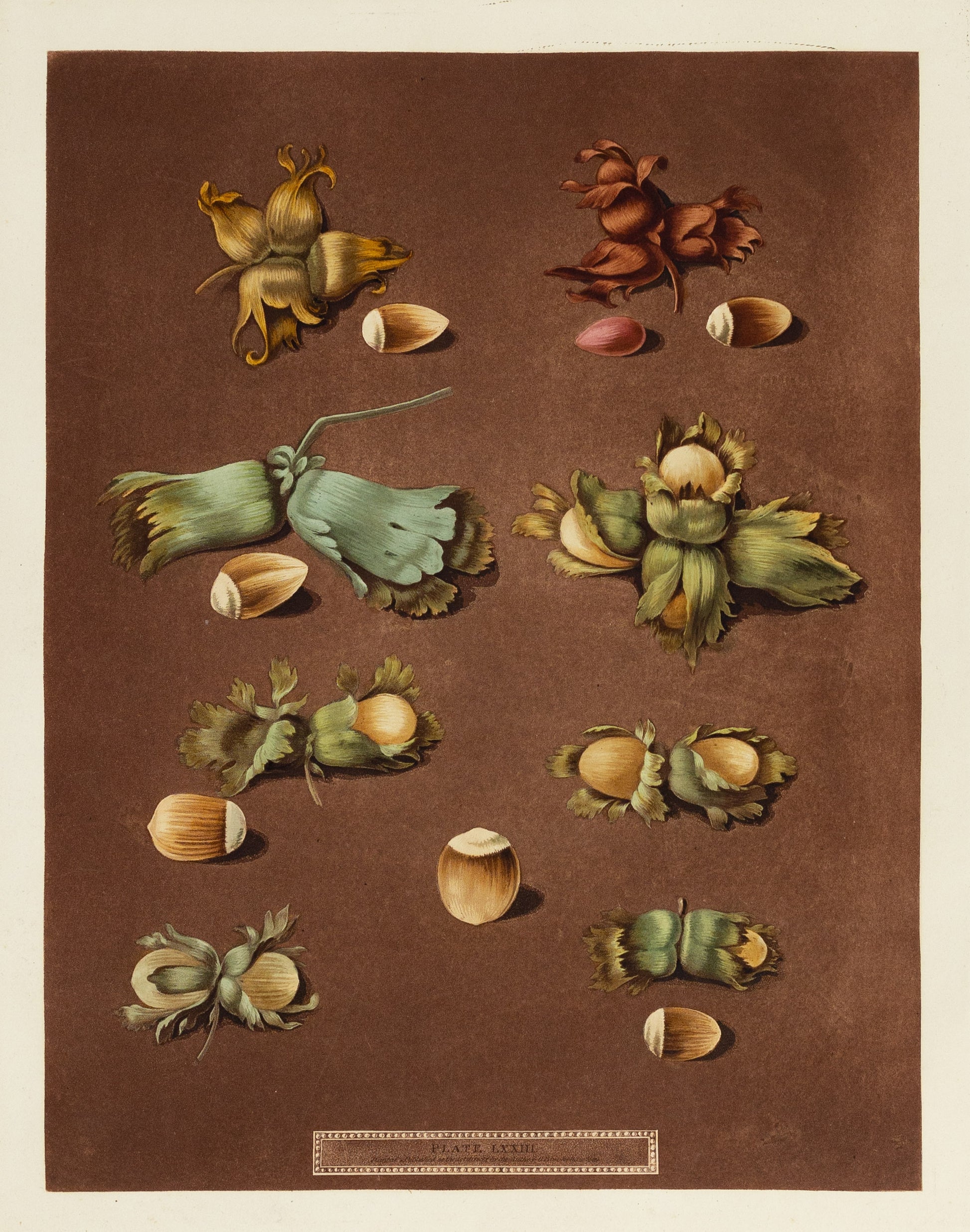 George Brookshaw (1751-1823), Plate LXXIII (73), Fritillaria Persica. White Filbert; Scarlet Filbert; Barcelona Filbert; English Cob Nut; two varieties from Isaac Swainson; White Hazle Nut; Brown Hazle Nut