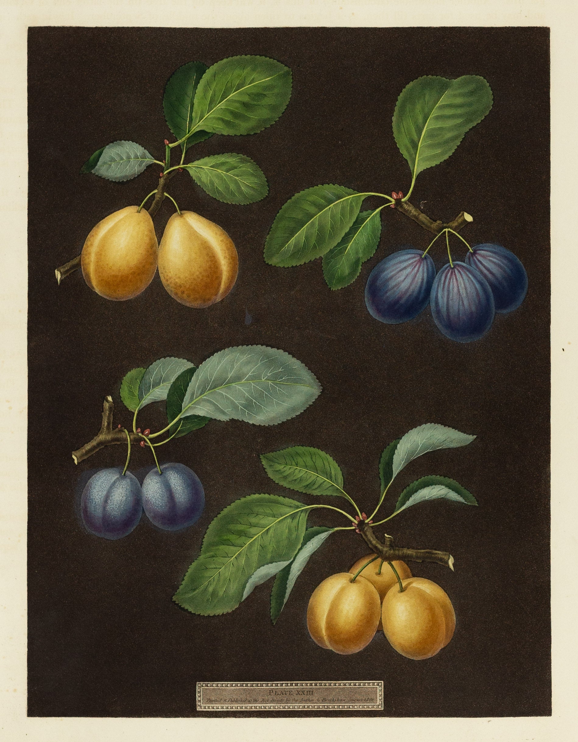 Brookshaw’s fine illustrations make excellent use of the rich, modulated tones that the aquatint process creates. The elegantly arranged and richly colored fruits emerge from deep brown backgrounds or float on a softly mottled light ground, creating a presence unlike that of any other botanical illustrations.