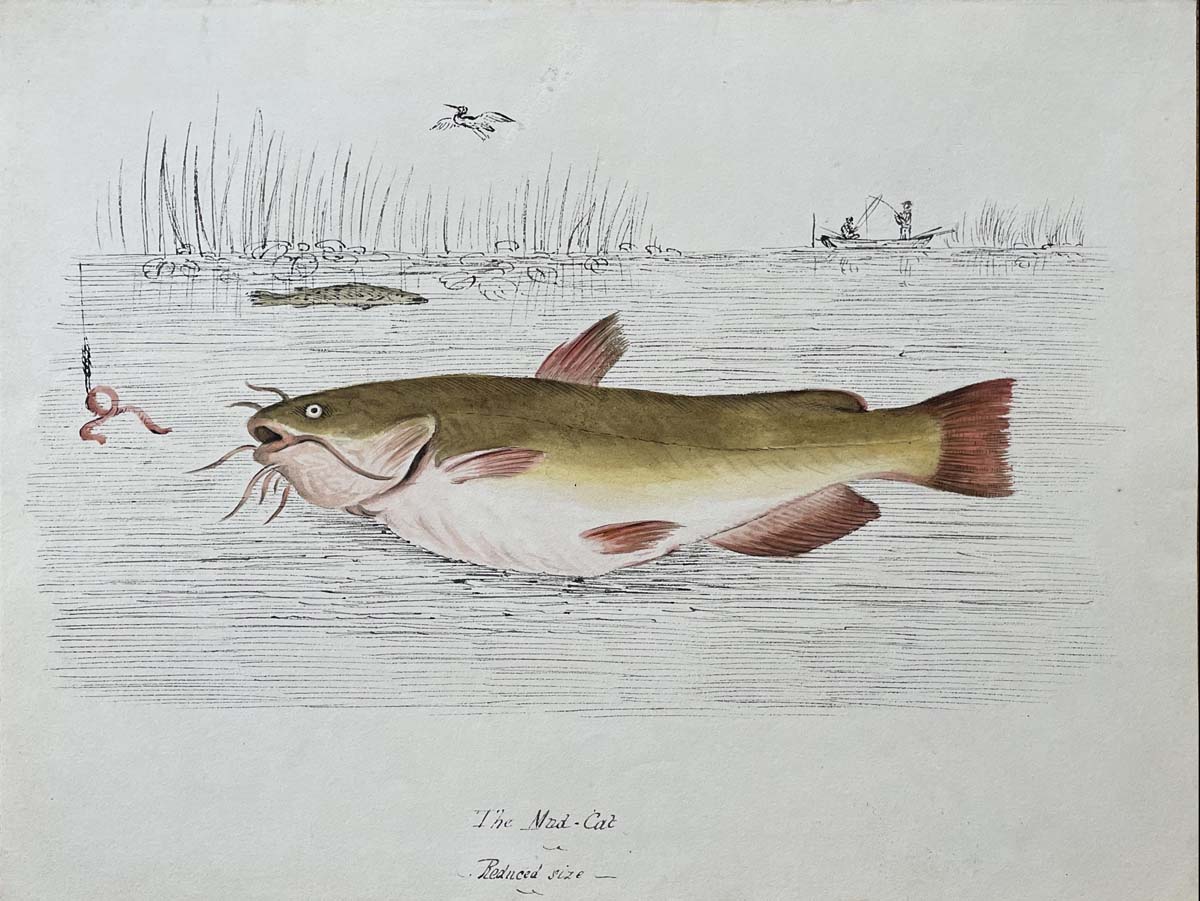 William Pope made a conscious decision to highlight wildlife by giving the primary subject delicate coloring in watercolor; whereas, the foreground and background are in a monotone pen and ink. The scenes often show a fish or bird on the ground or a shoreline, sometimes with a fishing or hunting scene in the background. The scenes are not generic. The inclusion of figures and sport hunting indicates that it was personal; he intimately knew the landscape, setting, hunting, and species.