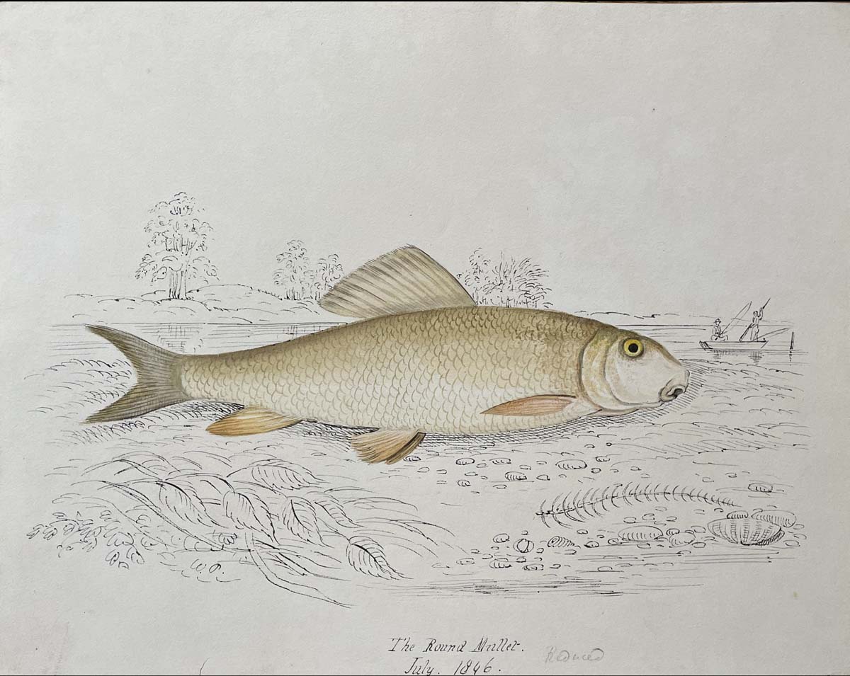 William Pope made a conscious decision to highlight wildlife by giving the primary subject delicate coloring in watercolor; whereas, the foreground and background are in a monotone pen and ink. The scenes often show a fish or bird on the ground or a shoreline, sometimes with a fishing or hunting scene in the background. The scenes are not generic. The inclusion of figures and sport hunting indicates that it was personal; he intimately knew the landscape, setting, hunting, and species.