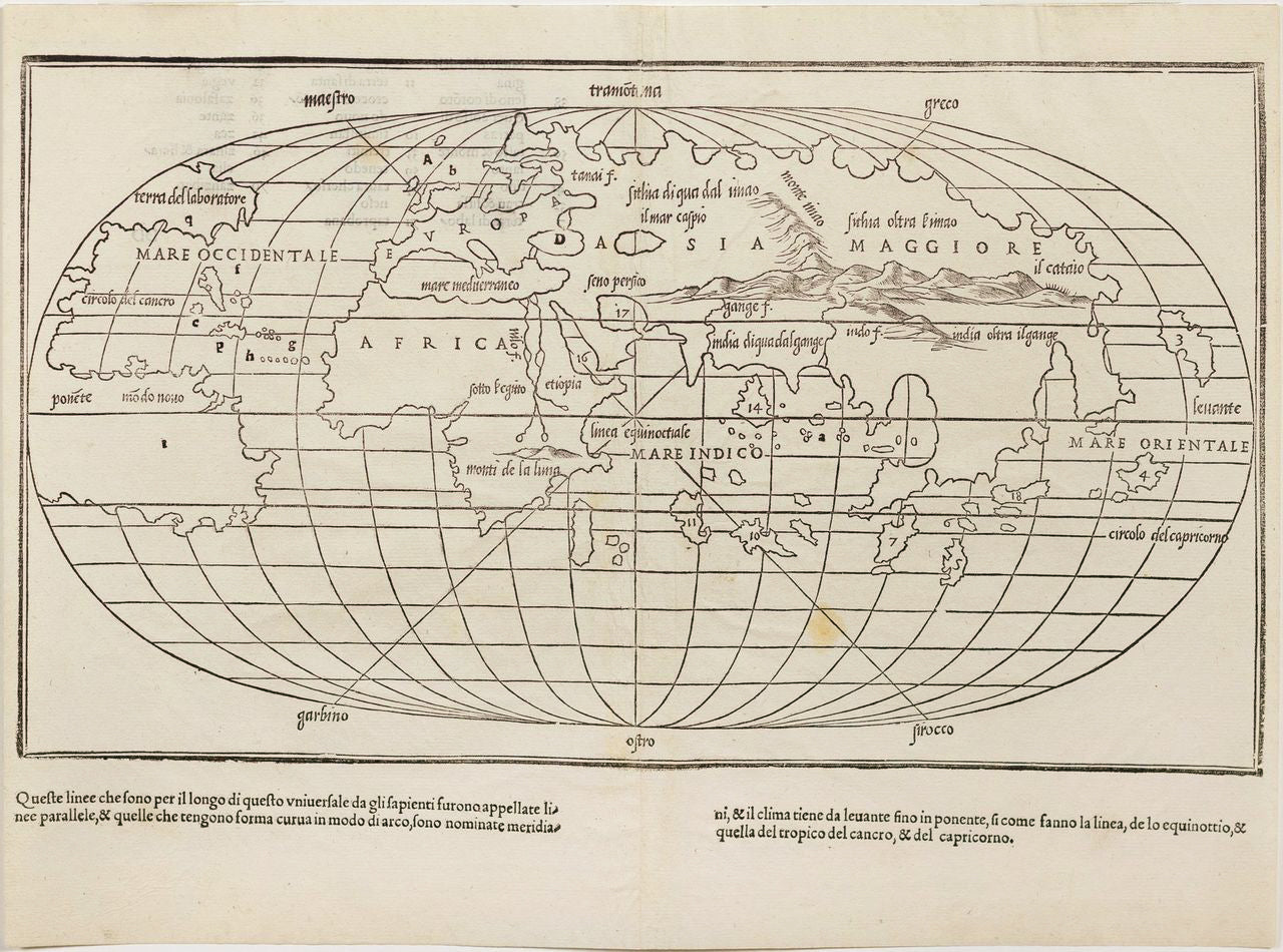 Bordone’s map is notable for its simplified, oval-shaped projection, which presents the world in a style distinct from the Ptolemaic tradition, reflecting the geographic advancements of the Renaissance. It highlights Europe, Africa, and Asia, while the Americas appear in a rudimentary form, illustrating the continent’s recent discovery and the incomplete knowledge of its extent.