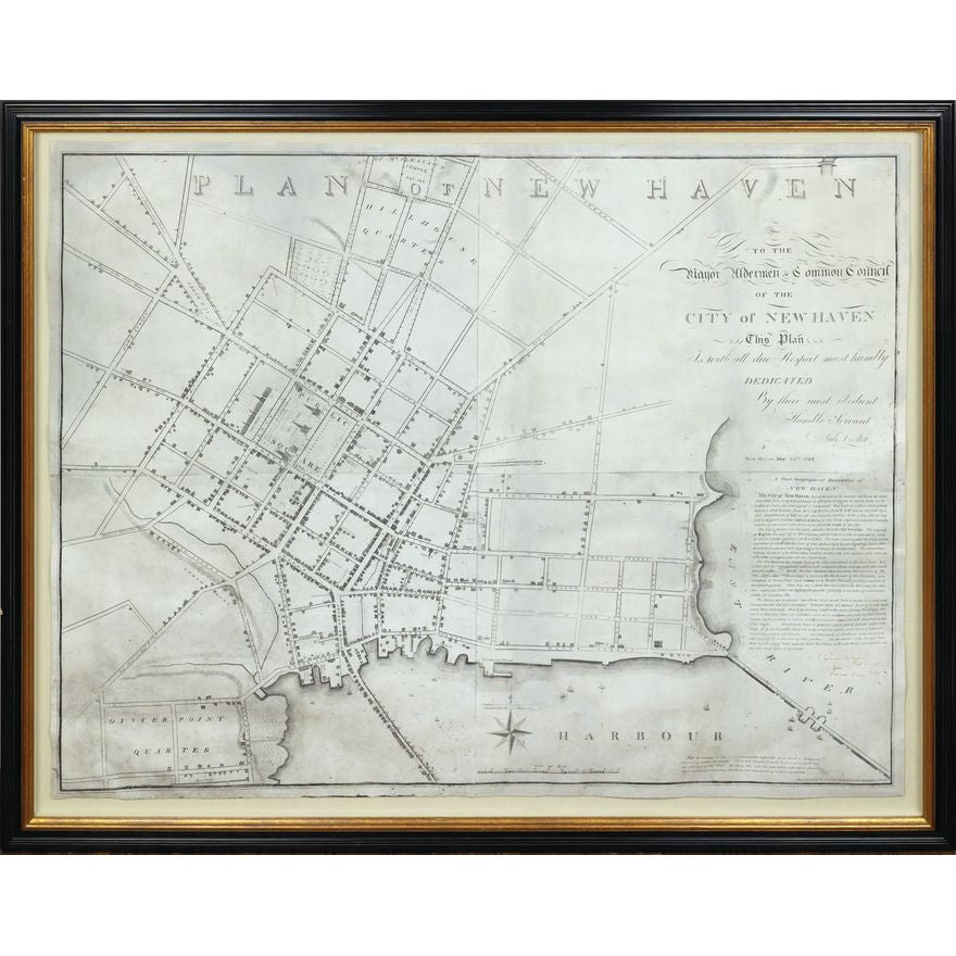 This rare map of New Haven is a trove of information about the city as it was in the early 19th century. It is also a most decorative piece of early Americana, with a distinctive Federal-era aesthetic including bold engraving, architectural features depicted in profile, and flamboyant calligraphic flourishes. This is the third edition of the map, which was first published in 1812 and reissued in 1817. On this new edition “the row of buildings to mark Yale College has now grown a little larger, and the placing of the churches on the common is slightly altered.” (Thompson)