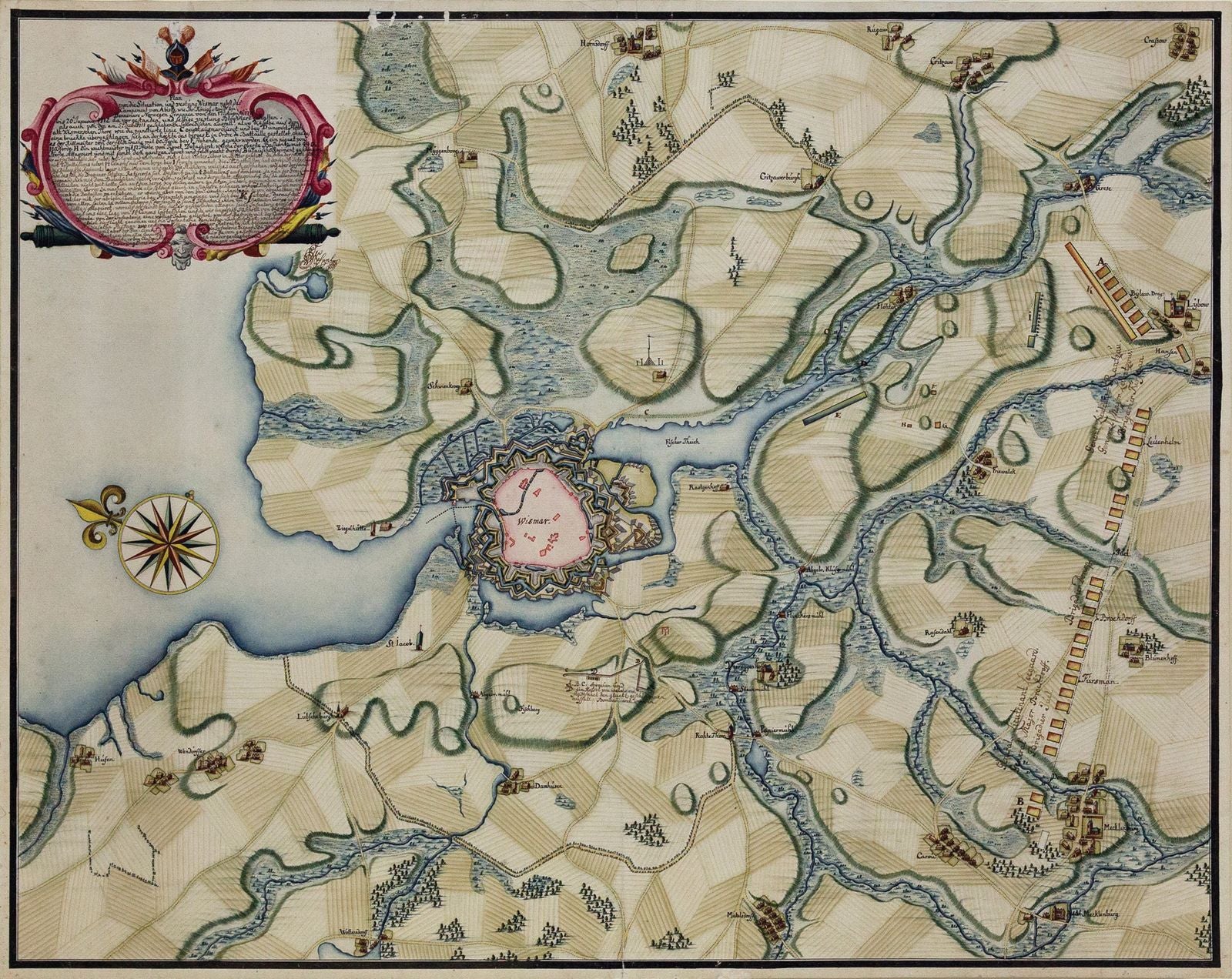 Beautifully colored manuscript map showing the military formations before the Battle of Wismar [Near the Hanseatic City of Wismar, Germany] between the Swedes and the Danish during the Great Northern War of 1700-1721.