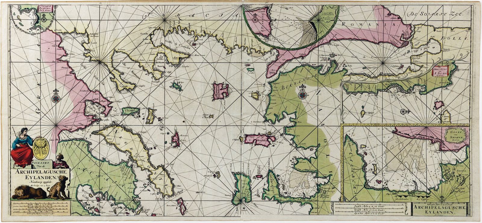 This sea chart represents the Northern Aegean Islands. It contains an enlarged inset map of the eastern coast of the Chios island as well as one of the gulf of Smyrna, in Turkey.From van Keulen's "De Nieuwe Groote Lichtende Zee-Fackel, part III.3.3. The atlas was published by Johannes van Keulen (1654-1715) and his son Gerard with the cooperation of the mathematician and surveyor, Claes Jansz. Voogt. The chart is an altered state with a scale with Italian miles added. Koeman calls the Van Keulen maps of paramount importance in the development of marine cartography.The chart is beautifully engraved with a large decorative cartouche, compass roses and rhumb lines.