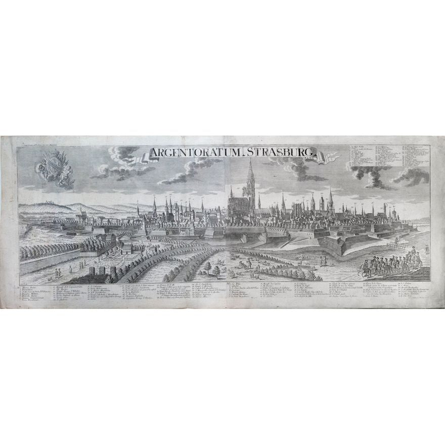 A dramatic and finely detailed panoramic view of Strasbourg, engraved by Georg Balthasar Probst and issued from Augsburg in the late 18th century. Seen from the west, the city stretches across the horizon, crowned by the soaring spire of the Strasbourg Cathedral—then the tallest building in the world. Probst’s work belongs to the tradition of vue d’optique city views, popular in the Enlightenment era, offering both aesthetic delight and educational value. These views were often displayed in optical viewers to enhance their depth, reflecting the fascination with perspective and global exploration. Strasbourg, as the capital of Alsace and a key cultural crossroads between France and the Holy Roman Empire, is here captured at a moment of architectural grandeur and political complexity.