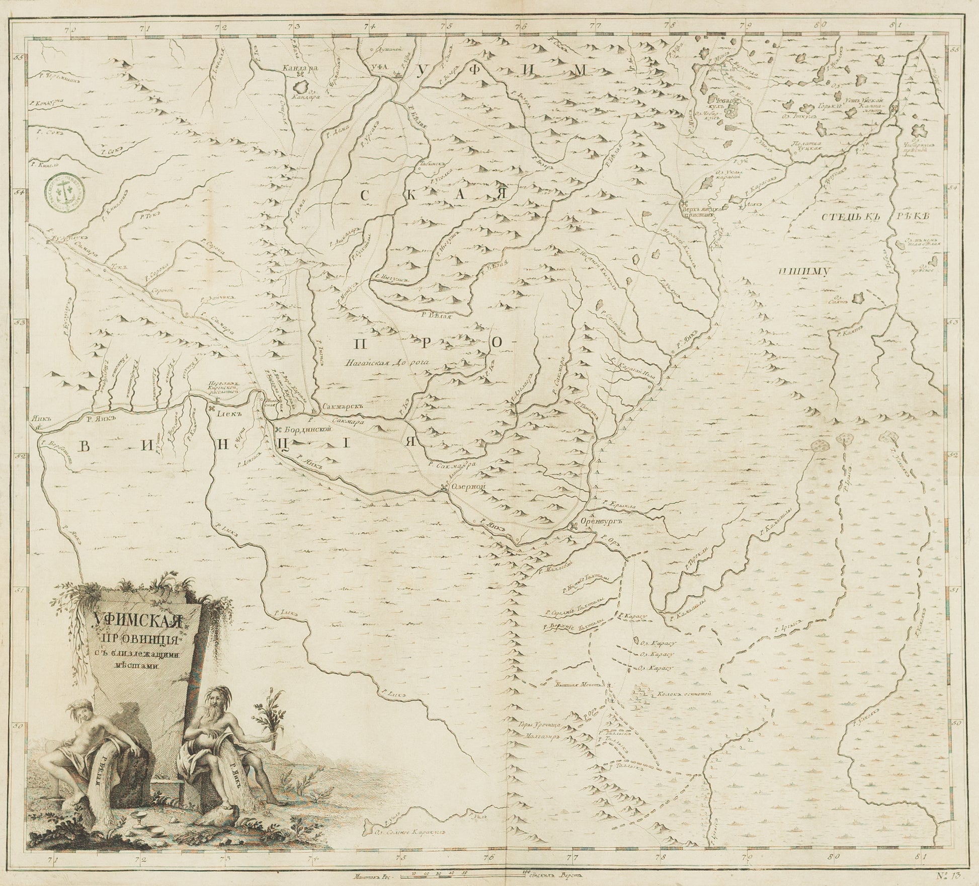 This rare and expansive Russian-language map of the Ufa Province and surrounding regions in western Siberia was produced under the direction of Jacques Nicolas de L’Isle, a French cartographer who was invited to the Russian Academy of Sciences in Saint Petersburg by Peter the Great’s successors. De L’Isle played a critical role in advancing Russian cartographic science in the 18th century and helped create some of the earliest modern maps of Siberia.