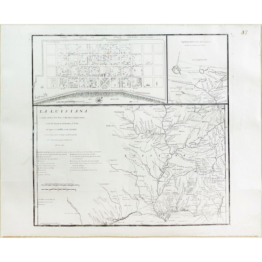 A Spanish Imprint of the Mississippi Valley. A scarce and significant Spanish map of Louisiana, probably produced to commemorate the secret cession of the area from France to Spain in the Treaty of Fontainebleau at the end of the Seven Years' War. Lopez credits the work of Jean Baptiste Bourguignon d'Anville as the basis of his map. Inset maps of "Plano de la Nuevo Orleans" after Bellin and "Suplemento del Rio Misissipi" after Delisle.