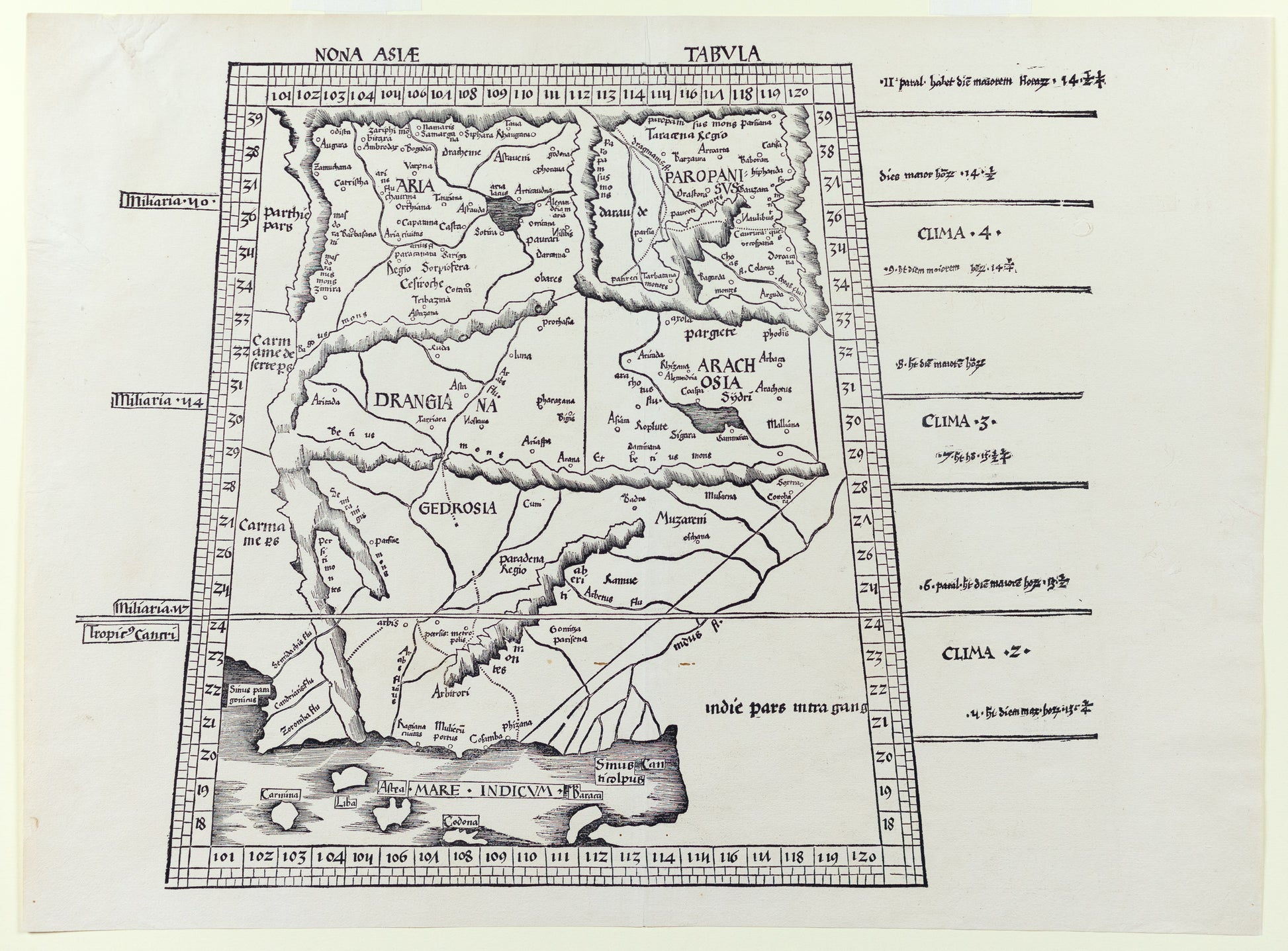 Single sheet (17 4/8 x 23 2/8 inches). FINE woodcut map of Pakistan, northwest India, showing the Ganges, Indus rivers, by Martin Waldseemüller (central vertical fold, tiny worn holes near the Indus dela). From the first modern atlas: "Geographie opus nouissima traductione e Grecorum archetypis castigatissime pressum", prepared by Martin Waldseemuller using the translation of Mathias Ringmann. One of the most important editions of Ptolemy, it contained many new regional maps based on contemporary knowledge "unlike many of the alleged 'new' maps produced by earlier editors, [they] contained a great deal of new information, and in nearly every case they were decided improvements over anything that had been previously offered." ("The World Encompassed", 56), were included in addition to the traditional body of twenty-seven Ptolemaic maps derived from the 1482 Ulm edition (or possibly from the manuscript atlas of Nicolaus Germanus that served as source for the latter). Schott's edition while initiated by the most famous of all early sixteenth-century cosmographers, Martin Waldseemuller and his associate Mathias Ringmann, partly at the expense of Duke Rene of Lorraine, was brought to completion by Jacobus Eszler and Georgius Ubelin. Claudius Ptolemy was an Alexandrine Greek, and a dominant figure in both astronomy and geography for more than 1500 years. "He compiled a mapmaker's manual usually referred to simply as the 'Geography'. He demonstrated how the globe could be projected on a plane surface, provided coordinates for over 8,000 places across his the Roman world, and expressed them in degrees of longitude and latitude. No maps drawn by Ptolemy himself are known to survive, but maps compiled from his instructions as outlined in his 'Geography' were circulated from about 1300.