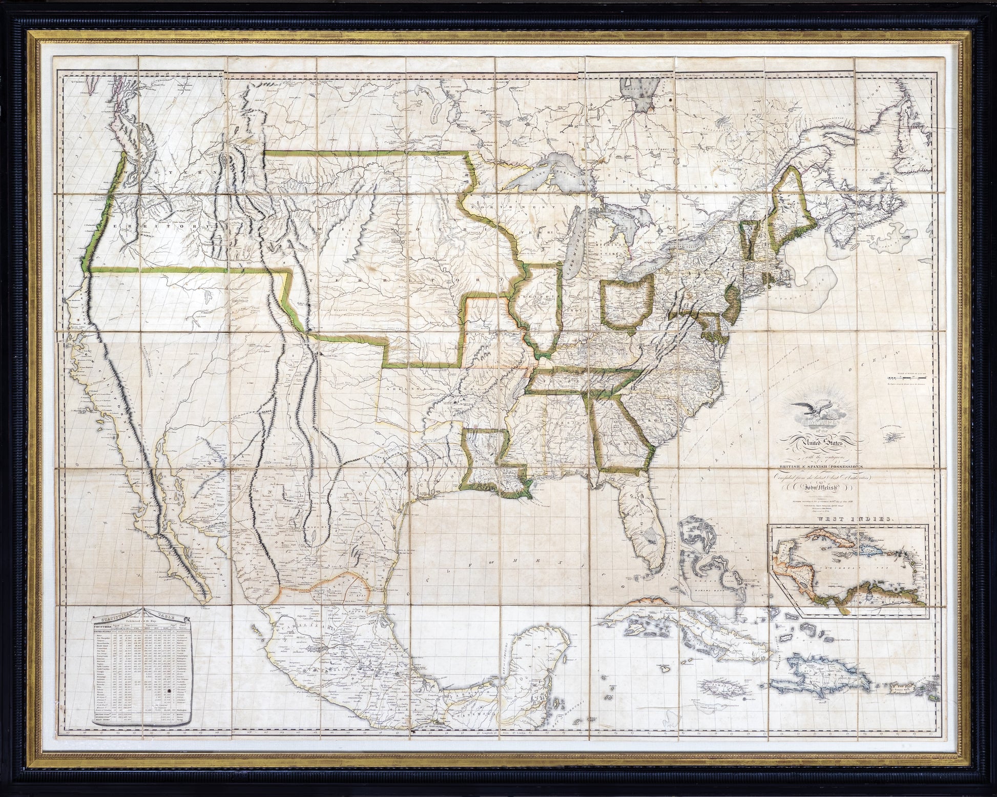 The second most important map in American history, juxtaposing for the first time the discoveries of Lewis and Clark, Zebulon Pike, Thomas Long, Thomas Nuttal and Andrew Ellicott. The first and most famous cartographic expression of “manifest destiny,” the map was a tempting invitation to Texas and a threat to Mexico. One of the most studied maps in America; research is available on request.