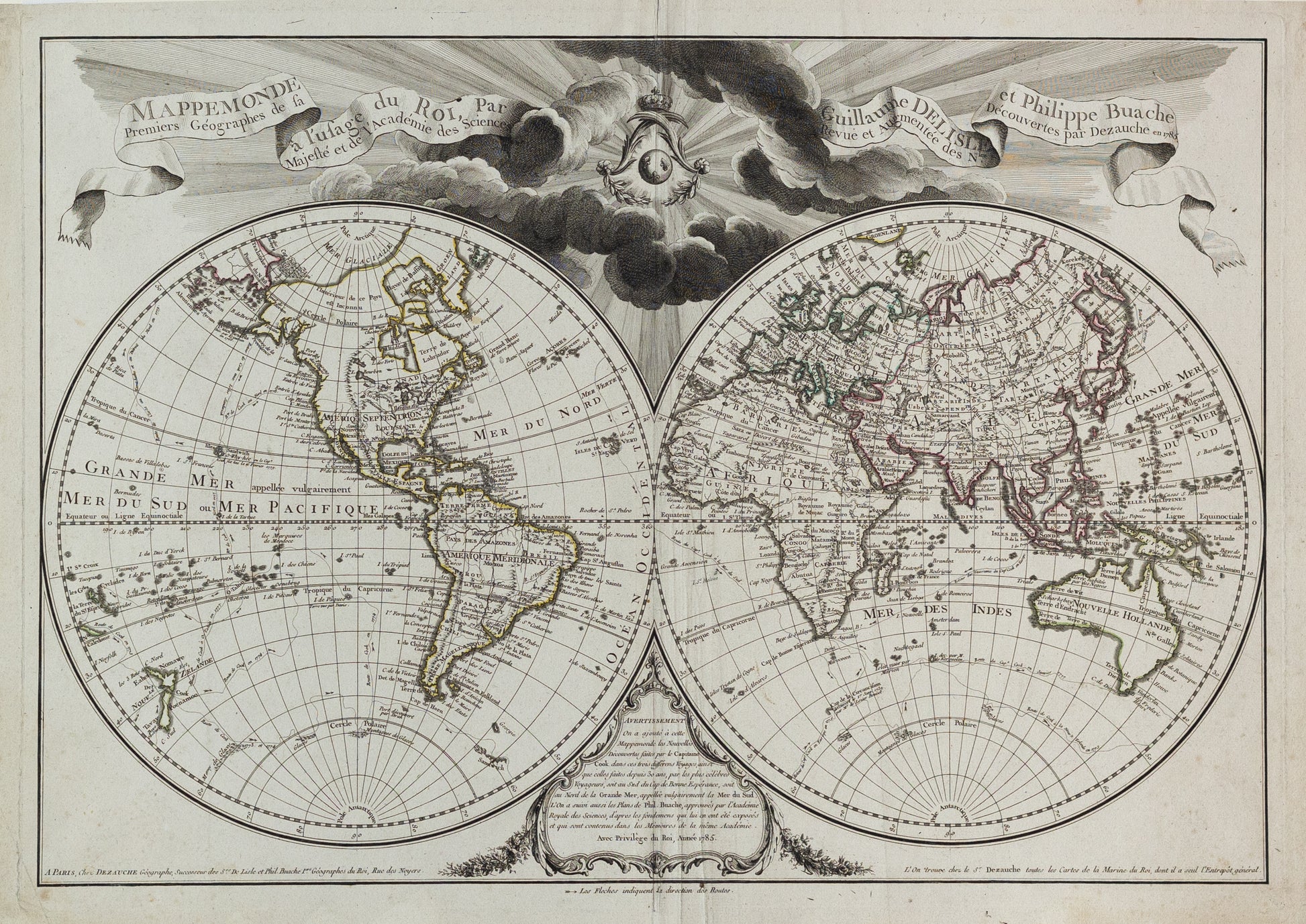 A richly detailed double-hemisphere world map representing Enlightenment-era cartographic knowledge, compiled by the foremost French geographers of the 18th century, Guillaume Delisle and his son-in-law Philippe Buache. This edition was published by Jean-Claude Dezauche, who inherited the prestigious Delisle-Buache publishing house.