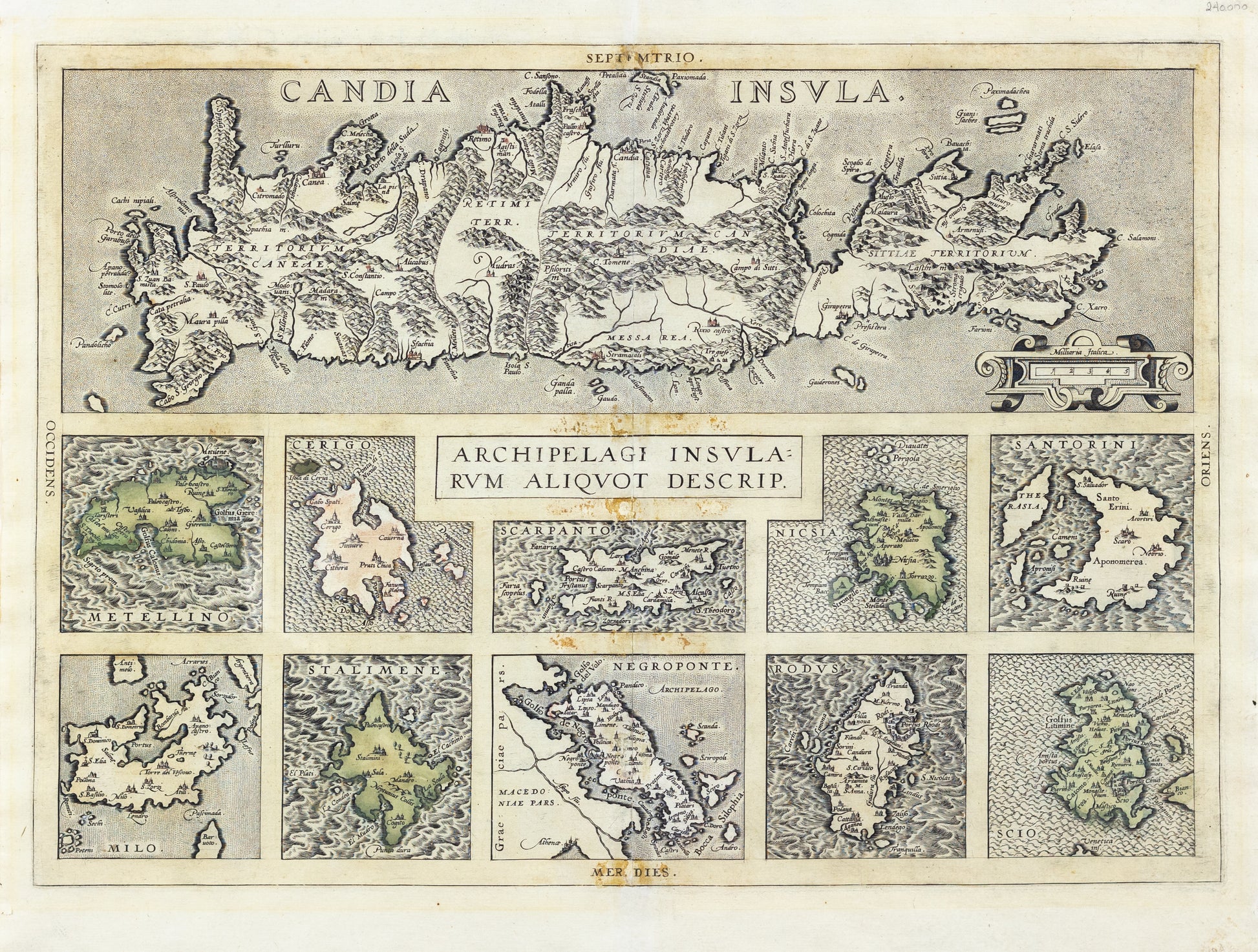 Ortelius, Abraham. Archipelagi Insularum Aliquot Descrip. Antwerp, 1617. [Crete, Metellino, Cerigo, Scarpanto, Nicsia, Santorini, Milo, Stalimene, Negroponte, Rodus and Scio].