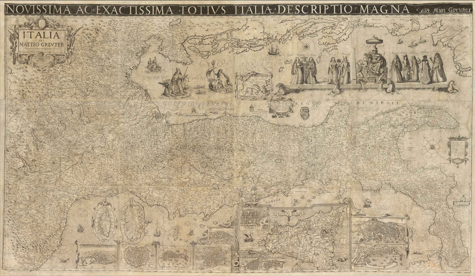 Greuter’s map of Italy must have been popular, as it was reissued several times over the course of nearly two centuries. First, it was re-released in Venice by Stefano Scolari in 1657; then, by Pietro Tedeschi and Giuseppe Longhi in Bologna in 1676; and then, by Domenico De Rossi in Rome in 1695. Finally, Tedeschi and Longhi released another example in 1713.