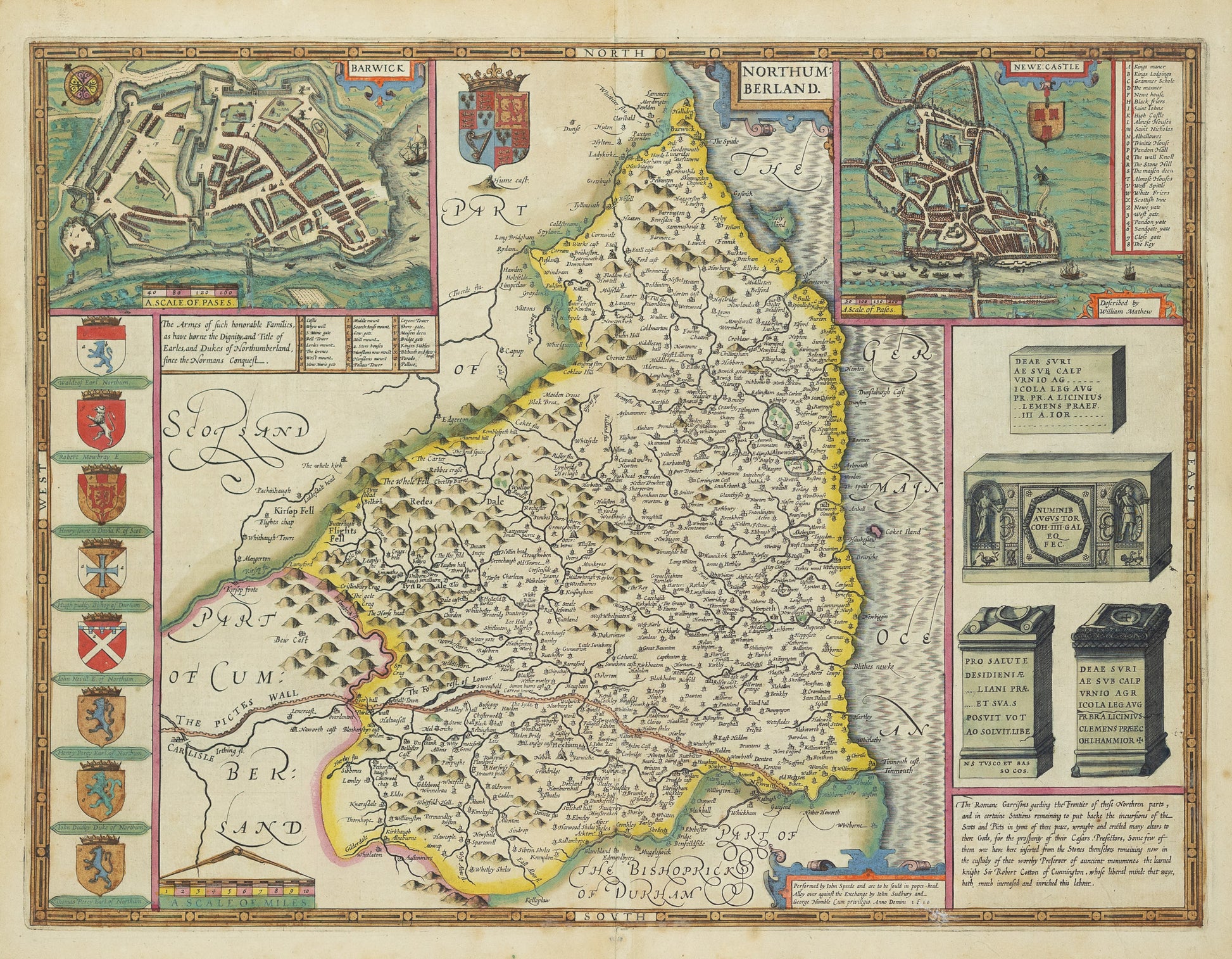 John Speed’s map of Northumberland, published in 1610 as part of his monumental Theatre of the Empire of Great Britaine, is among the earliest detailed county maps of England. Combining cartographic precision with rich decorative elements, this map illustrates not only the geography of Northumberland but also its historical identity—complete with coats of arms, battle scenes, and inset town plans (including a detailed view of Newcastle upon Tyne). Speed’s work was the first comprehensive atlas of the British Isles and a defining achievement in English mapmaking, reflecting both rising national pride and a deepening interest in regional identity during the early Stuart period.