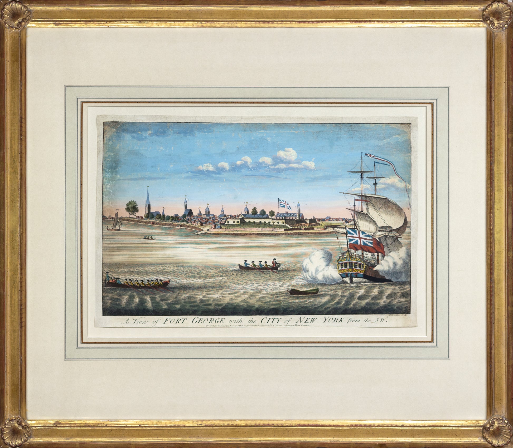 This early view of New York depicts the southern tip of Manhattan Island as it appeared sometime between 1731 and 1736 (likely around 1734). Almost certainly the view originated from a drawing by the English immigrant artist William Burgis (active 1717–1730s) since the right half of the print showing the fort and the large ship in the foreground replicates a mezzotint that Burgis dedicated to John Montgomerie, the colonial governor of New York. King George II appointed Montgomerie in 1728, but he governed only a few years before dying in 1731 during a small pox epidemic. The view is one of the earliest depicting New York from the west with the broad Hudson River in the foreground. Stokes refers to the view as “one of the most important, interesting, and sought-after prints of Old New York” (Volume 1, plate 31, page 269).