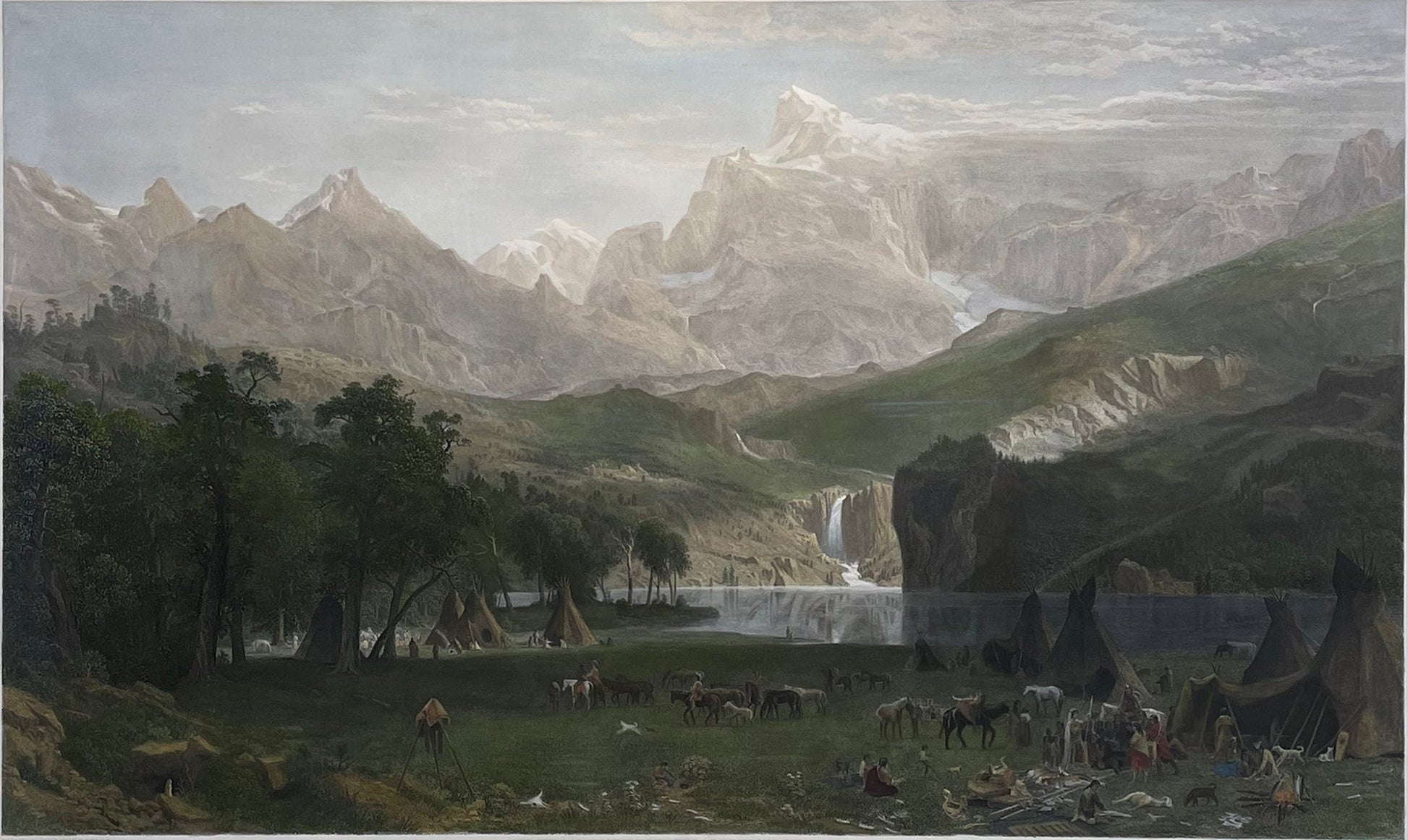 Albert Bierstadt (1830-1902) was the nineteenth century chronicler par excellence of the American West. He undertook several trips to the Rocky Mountains and Yosemite Valley, where he made sketches of what would later become his most famous paintings. This brilliant chromolithograph depicts light breaking through a bank of thunderclouds above a valley. Indians on horseback dash down a mountainside toward an encampment of tepees along the valley. This image brilliantly captures American landscape painting of the period at its most heightened and rapturous. This chromolithograph was issued by Thomas McLean as a pair to The Rocky Mountains (Landers Peak). As many as 20 stones stones were used to capture the rich, sumptuous palette of the original painting, which now resides in the Brooklyn Museum of Art.