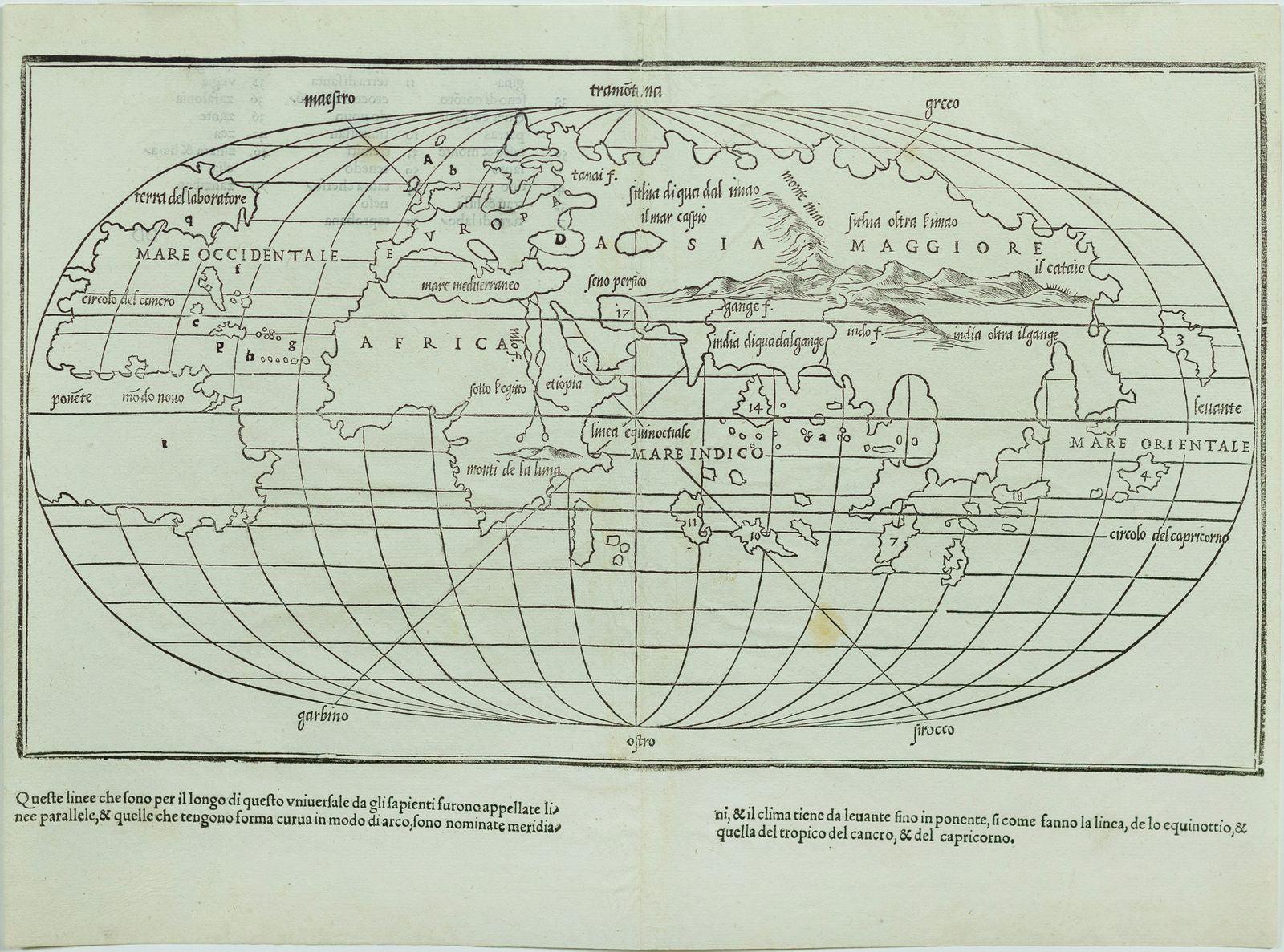 Woodcut world map on an oval projection from Bordone's Isolario.