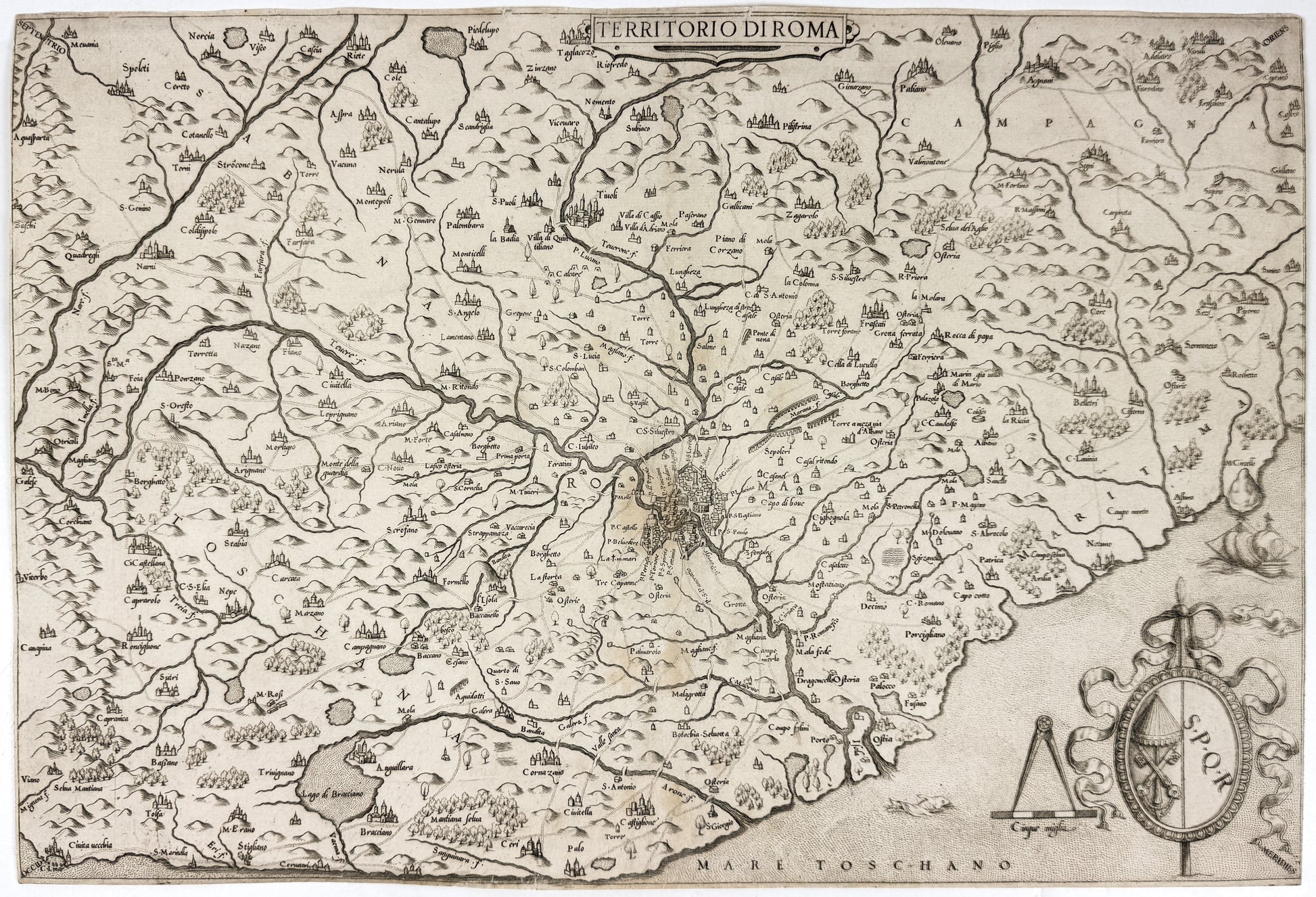 Giovanni Francesco Camocio (active from the 1550's through the 1570's) was one of a group of Italian cartographer-booksellers known, a little artificially, as the "Lafreri school." His name has come to be associated with the present map because it was added in later states, this being the first of Bifolco-Ronca's four; the point is the absence of an address below the scale. Camocio appears to have cut a near-replica of an anonymous map dated 1557, which is itself based upon a 1556 map attributed to Vincenzo Luchini, all deriving ultimately from a 1547 map of Eufrosino della Volpaia. These maps all depict Lazio (the territory immediately surrounding Rome) with North at the upper-left corner (i.e., NE at the top). Visible within the city of Rome are the Castel Sant'Angelo, Pantheon and Colosseum.