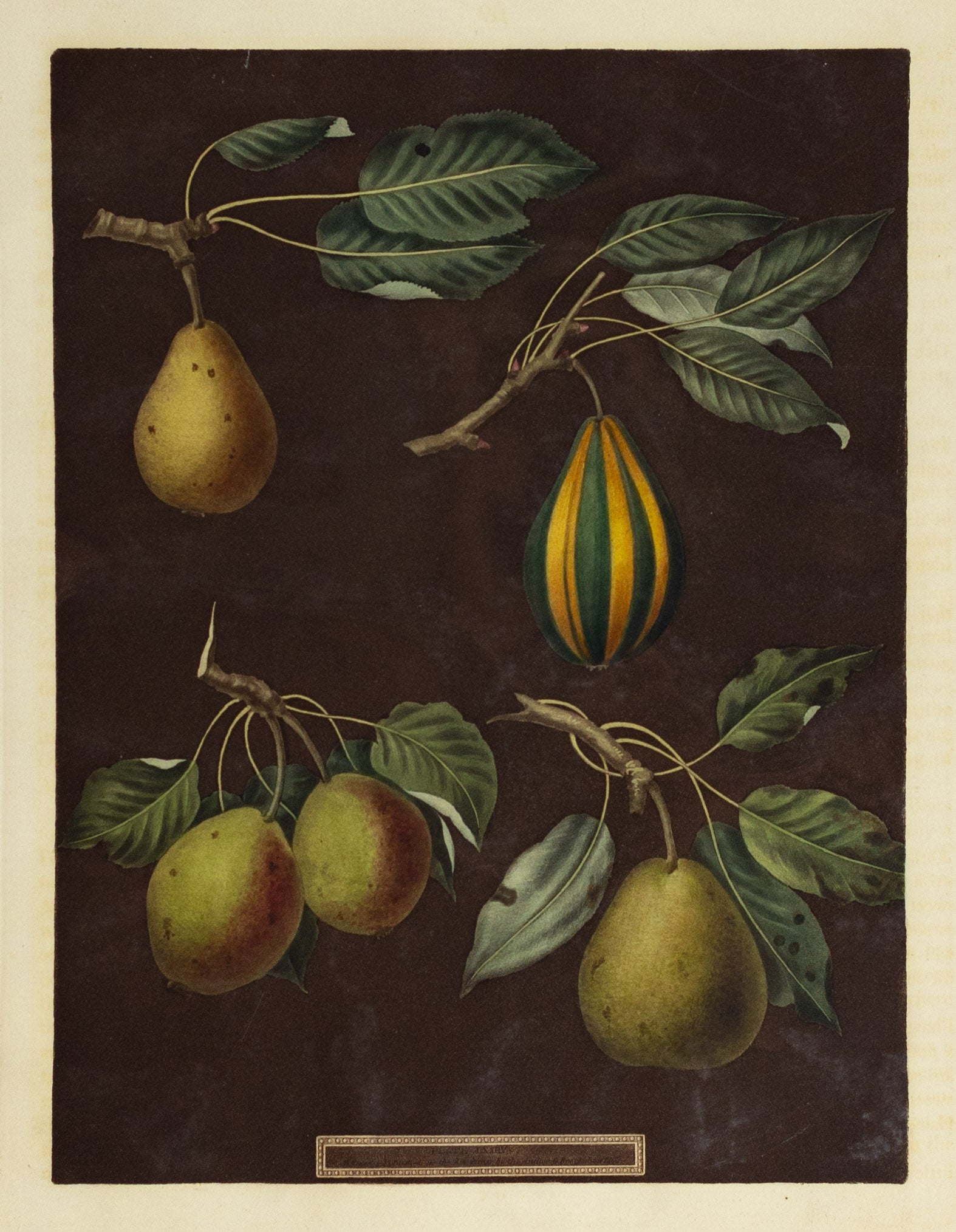 Brookshaw’s fine illustrations make excellent use of the rich, modulated tones that the aquatint process creates. The elegantly arranged and richly colored fruits emerge from deep brown backgrounds or float on a softly mottled light ground, creating a presence unlike that of any other botanical illustrations.