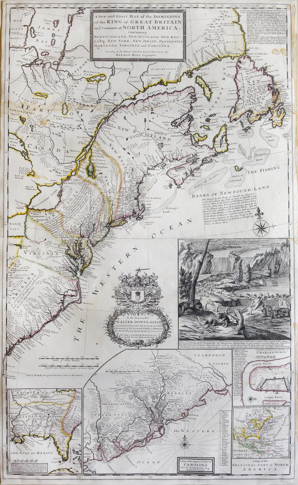 Handsome example of the famous "Beaver Map," Moll's most celebrated effort as it documents the ongoing dispute between Great Britain and France over the boundaries separating their colonies in America. The map explains the postal routes throughout the British territories and is generally thought to be the first postal map of the colonies. The striking beaver inset serves to not only symbolize the Puritan industriousness needed to settle in America, but also the lucrative fur trade spreading wealth and opportunity among the colonies. Plate 78 in Schwartz / Ehrenberg "The Mapping of America".