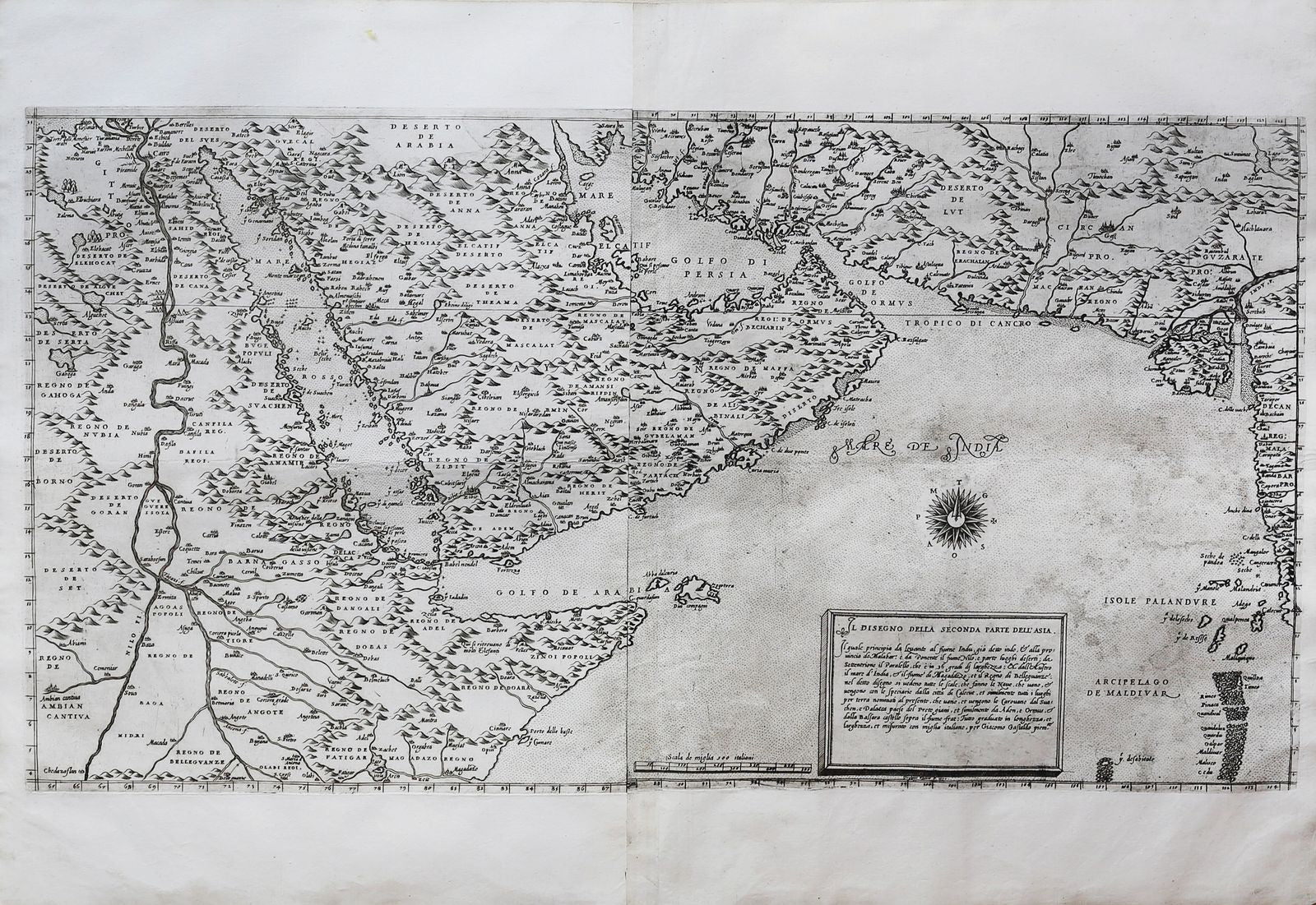 I nomi antichi, et moderni della seconda, et terza parte dell’Asia, delle Provincie, Regni, Regioni, Città, Castelli, Monti, Laghi, Fiumi, Mari, Golfi, Porti, Capi, et Isole; Graduati in longhezza, et larghezza. A ritrovare i detti nomi nel disegno, bisogna distendere un filo sopra i gradi e minuti de longhezza, et un’altro sopra i gradi, e minuti di larghezza, e dove i fili se incroseranno sarà il luoco, che ricercate. Di Giacomo de’ Gastaldi, Piamontese Cosmographo, in Venetia. Engraved gazetteer on one sheet.