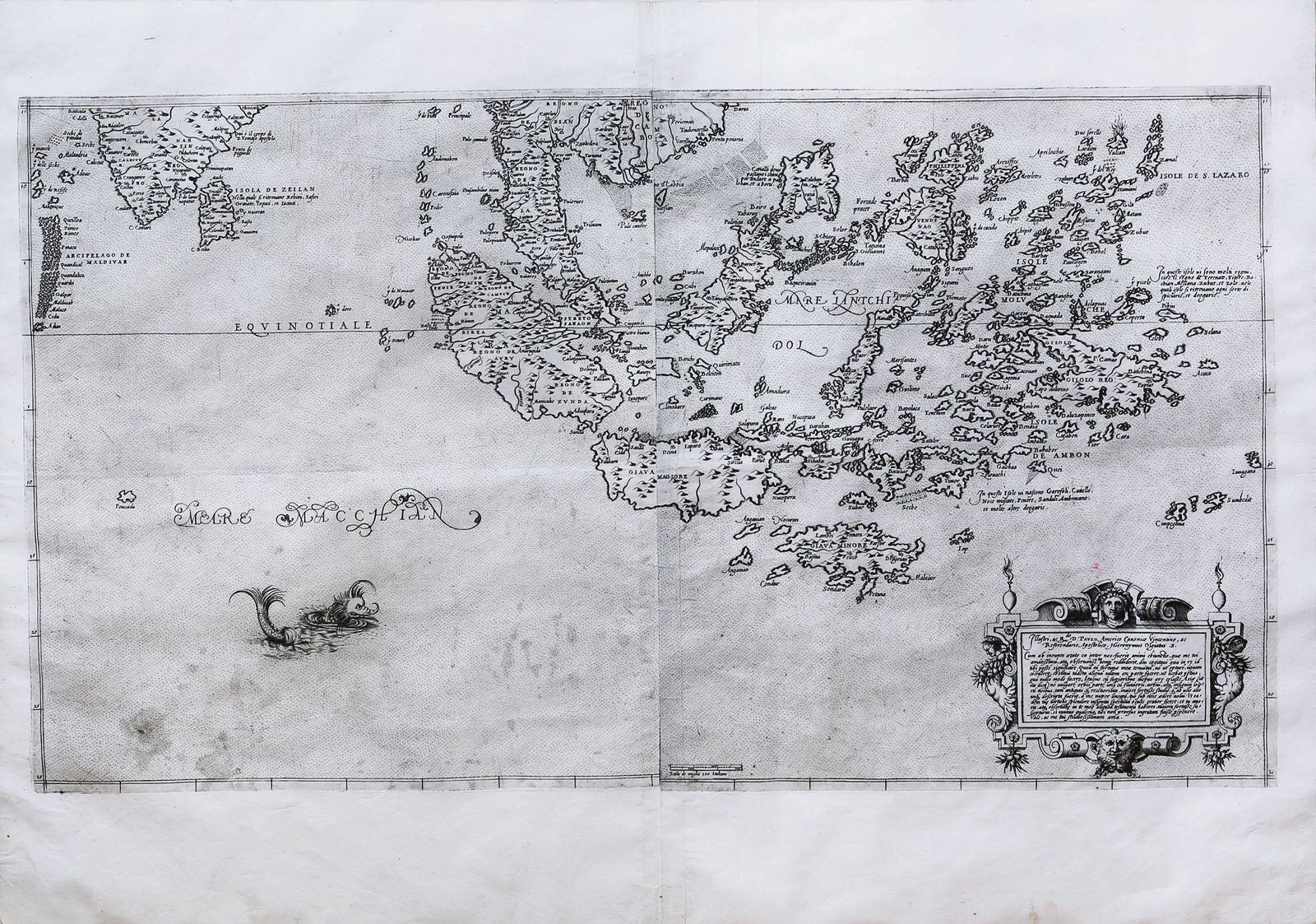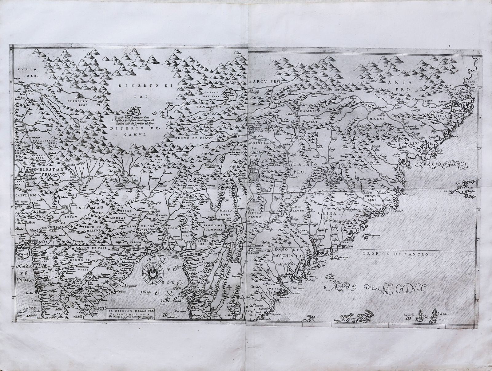 Gastaldi’s maps — each free-standing— were far and away the most complete account of Asia; it was not until Olgiato’s 1570 edition that the whole project was unified into a single work (although the first and second parts could not in fact be joined; the third and fourth parts also overlap). Bifolco-Ronca in their 2018 Cartografia e topografia italiana del XVI secolo (vol. I, tav. 75) count in a census 5 examples complete with the gazetteers: in the privately-held “Atlante Aragona,” at the National Library in Budapest, at the Newberry Library in Chicago, at the Bayerische Staatsbibliothek in Munich and at the Biblioteca Universitaria Alessandrina in Rome. They also mention the present example, which was sold at Sotheby’s London 14 December 2000 — but, crucially, offered as three separate lots: 245 (…seconda parte), 298 (…prima parte) and 330 (…terza parte and fourth part). The consignor(s) is (are) undesignated, and so it cannot be said definitively whether the four parts are married, but given the extreme rarity of the map, they have likely traveled together since their production.