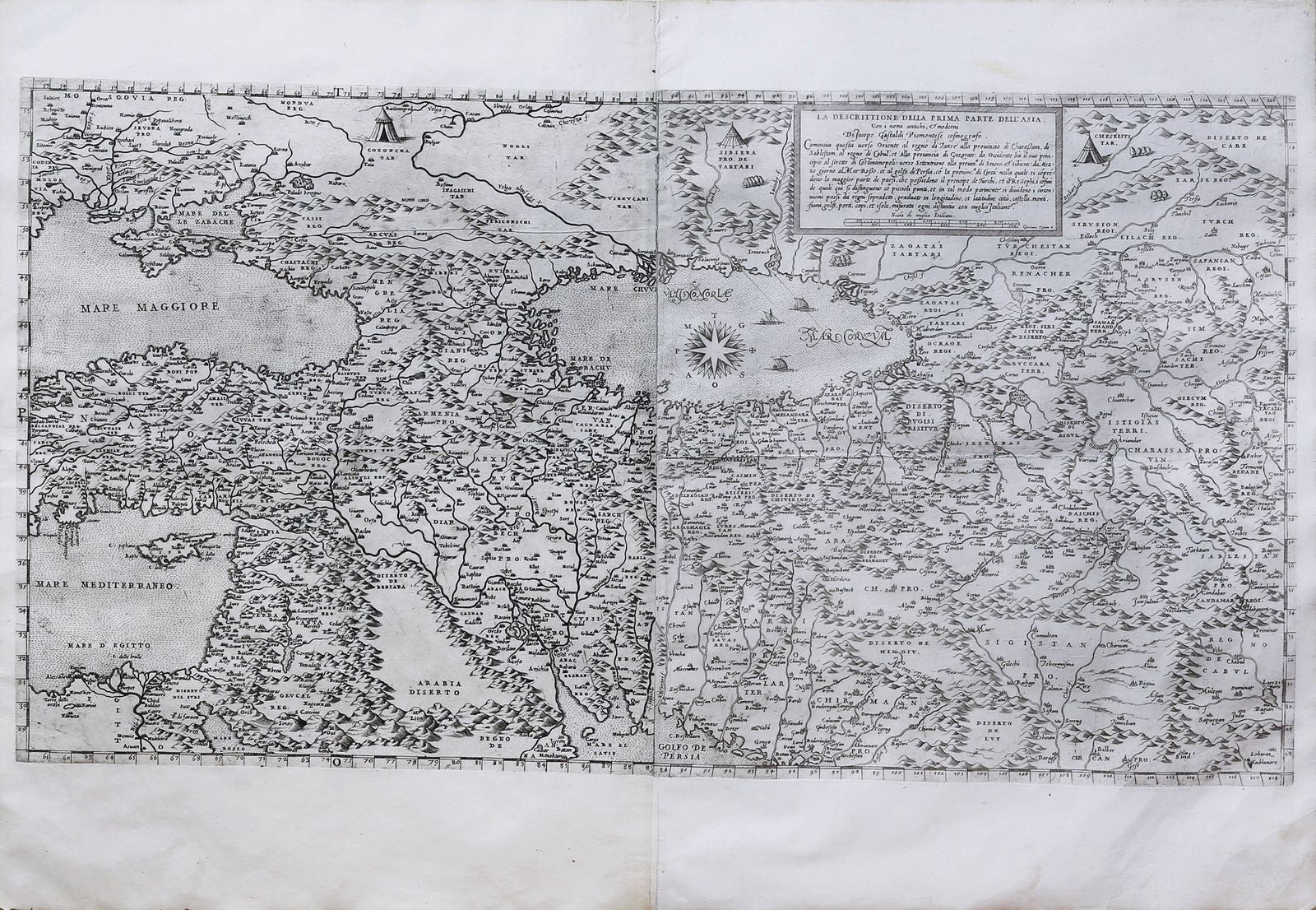 I nomi antichi, et moderni della prima parte dell’ Asia, delle provincie, regni, regioni, città, castelli, monti, laghi, fiumi, Mari, Golfi, Porti, Capi, & Isole: graduati in lunghezza, et larghezza. A ritrovare i detti nomi del dissegno, bisogna distendere un filo sopra i gradi, e minuti di lũghezza, et un’altro sopra i gradi, e minuti di larghezza: et dove i fili s’incroserano, sarà il luogho, che si ricercherà. Di Giacobo de’ Gastaldi Piamontese, Cosmografo. Engraved gazetteer on one sheet.