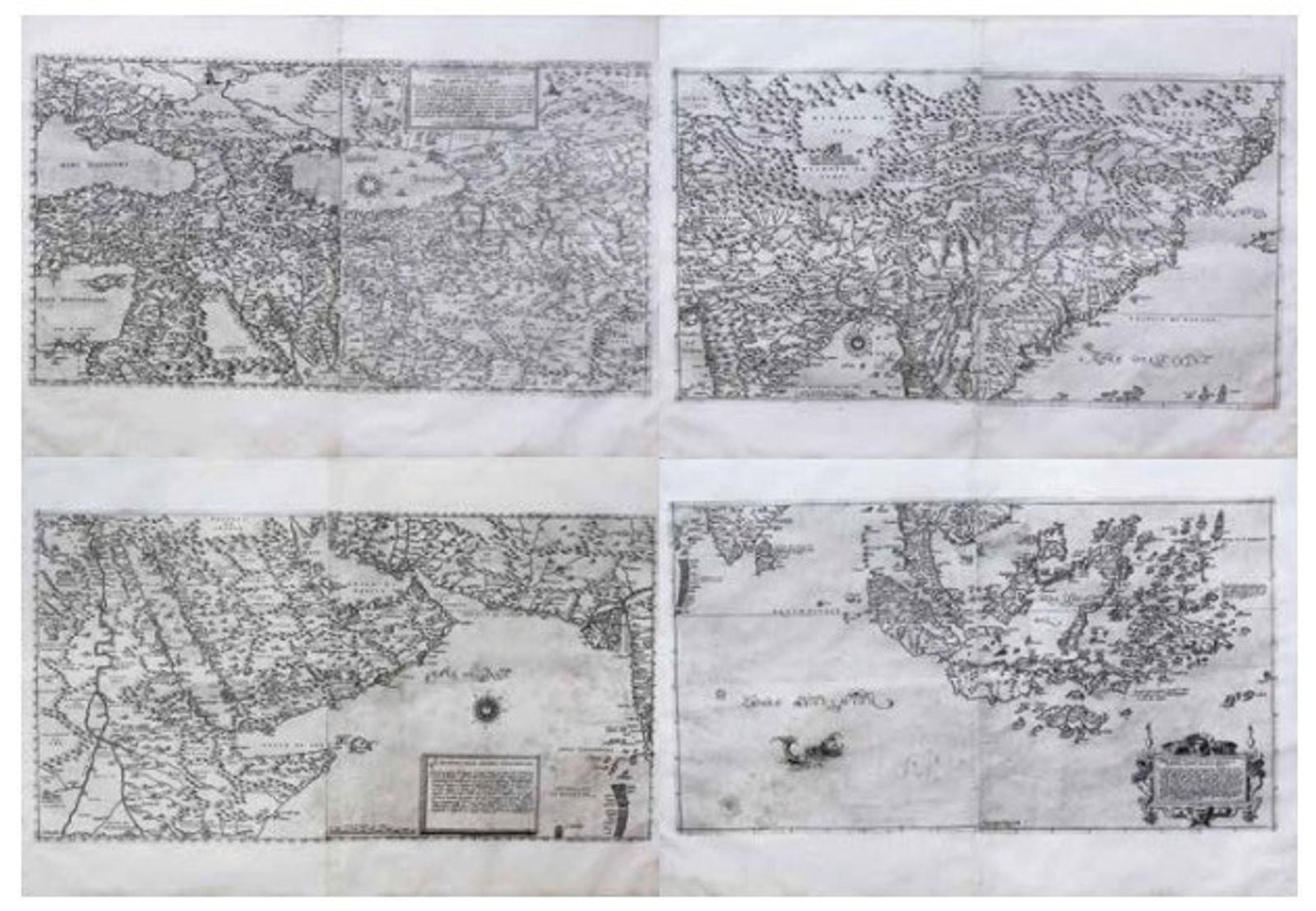 Following the piece-meal production of the Gastaldi-Lafreri-Forlani-Bertelli maps over nine years, Girolamo Olgiato (Olgiati, active 1567–1570), known only by his engravings, issued the present four-part map — with the seas in stipple rather than waves, as in the 1559 first part —in 1570 (though the date appears only in the cartouche of the second part). The map was issued in eight separate sheets (see the example at the Alessandrina in Rome [Rari 272], reproduced in Bifolco-Ronca), in the present example each quadrant is joined horizontally, thus with some loss to the inner scales. Bifolco-Ronca notes “i quatro fogli non sono pensati per essere uniti,” that is, they could not be joined into a single map. Indeed, even the joins of each quadrant are generally imperfect, although close enough to be considered intentional.