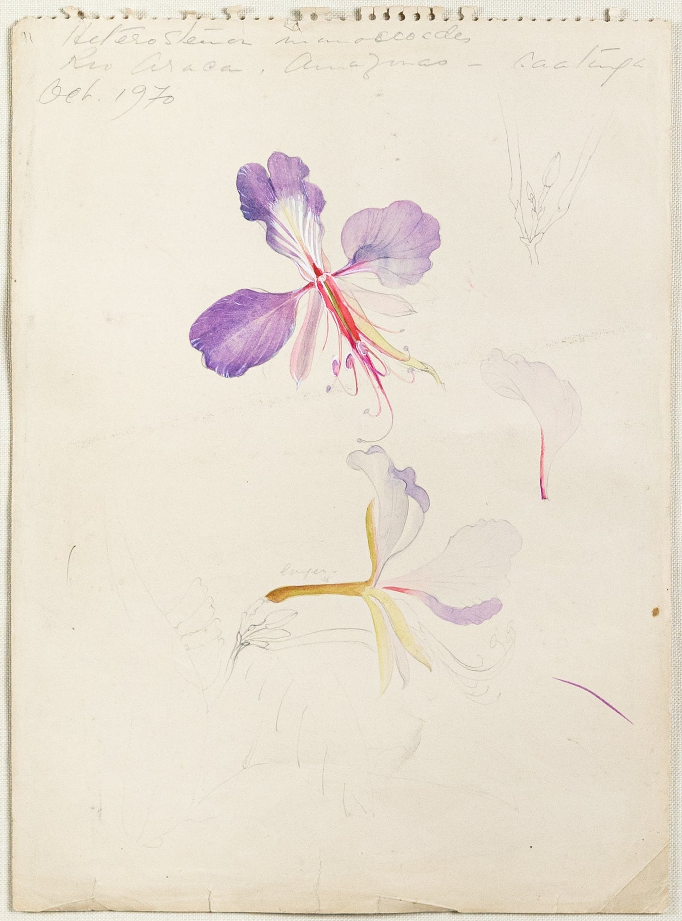 A field sketch of a Heterostemon mimosoides from the caatinga (ie forest growing on light, sandy soil). In her diary of her sixth expedition, Mee recorded, “we reached Sumauma [...] there I found Heterostemon mimosoides, a small tree growing in the igapo [ie forest permanently flooded by black water rivers], with large purple flowers resembling Bauhinia in form. I tried to paint the delicate blooms which began to wilt as soon as they were gathered but [...] this was impossible [...] My next encounter with this beautiful tree, with its amethyst flowers and deep green leaves that resemble those of Mimosa, was on the Rio Cuieiras, a tributary of the great Rio Negro. There, seated in my boat, I was successful in capturing the colour and form before the fragile flowers drooped and faded [...] Adolpho Ducke, the great Brazilian botanist, described [the Heterostemon mimosoides] as ‘Probably the most beautiful of all