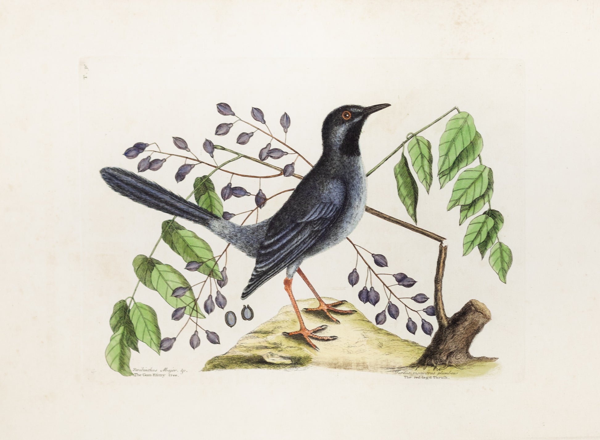 Catesby, Mark. Vol.I, Tab. 30, The Red-leg'd Thrush & the gum-elimy tree