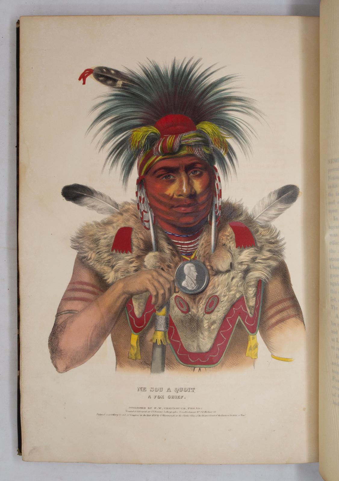 3 volumes, folio (20" x 14 1/2"). 120 handcolored lithographed plates heightened with gum arabic after Charles Bird King, Karl Bodmer, James Oto Lewis, P. Rindisbacher, and R. M. Sully, drawn on stone by A. Newsam, A. Hoffy, Ralph Trembley, Henry Dacre and others, printed and colored by J.T. Bowen and others, leaf of testimonials regarding the genuineness of the portrait of Pocahontas, leaf of lithographed maps and table and 17 pages of facsimile signatures of subscribers in vol. 3, BAL State C of vol. 1 title-page, State B of vol. 2 title-page, State A of vol. 3 title-page, War Dance frontispiece (in vol. 1) in State D, Red Jacket plate in State F; dampstaining and occasional scattered foxing to text, most pronounced in vols. 1 and 3, most plates cockled, some marginal dampstaining, occasional toning or mottling of plates, light to moderate text offsetting to plates throughout. Contemporary half green morocco gilt over brown marbled boards, the spines in 7 compartments gilt-filleted, lettered and numbered with raised bands, nonpareil marbled endpapers, marbled edges; extremities rubbed, several scrapes to boards (some with rudimentary repairs), lower edge of vol. 1 front board slightly bumped.