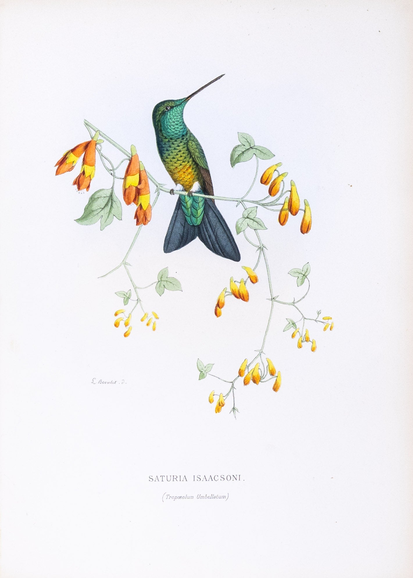 Histoire Naturelle des Oiseaux-Mouches, ou Colibris constituant la famille des Trochilïdes (“The Natural History of Hummingbirds constituting the Trochilidae family”) was published in 1874 by prominent French naturalists Martial Étienne Mulsant (1797-1880) and Édouard Verreaux (1810–1868). This extremely rare monograph features 117 exceptional hand-colored lithographs of the known species of hummingbirds, members of the Trochilidae family. Histoire Naturelle was originally published in 64 plates in four volumes by L Bevealet & Mesplis in Lyon.