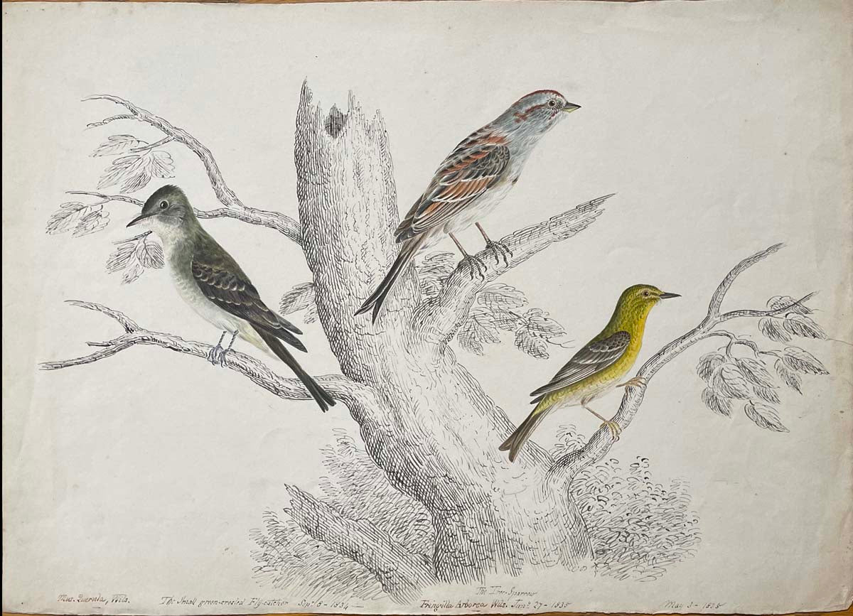 Musguerula, Wils. The small green crested flycatcher Sept 8 1834/The tree sparrow fringilla arborea Wils. Jan 27 1835 Pen and ink and watercolor