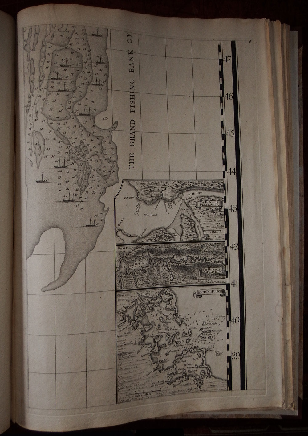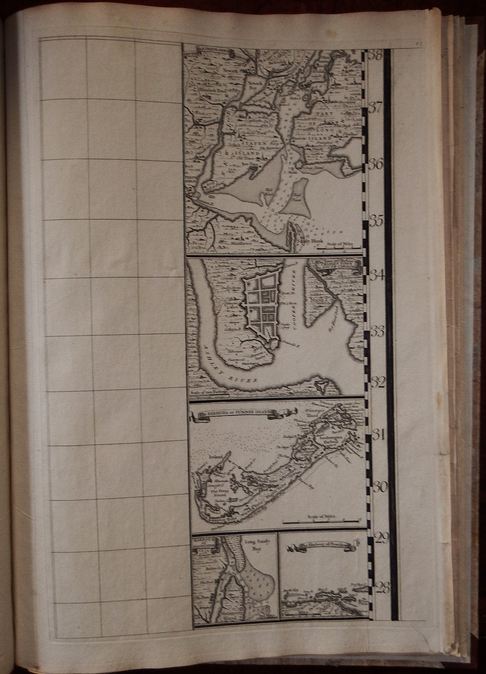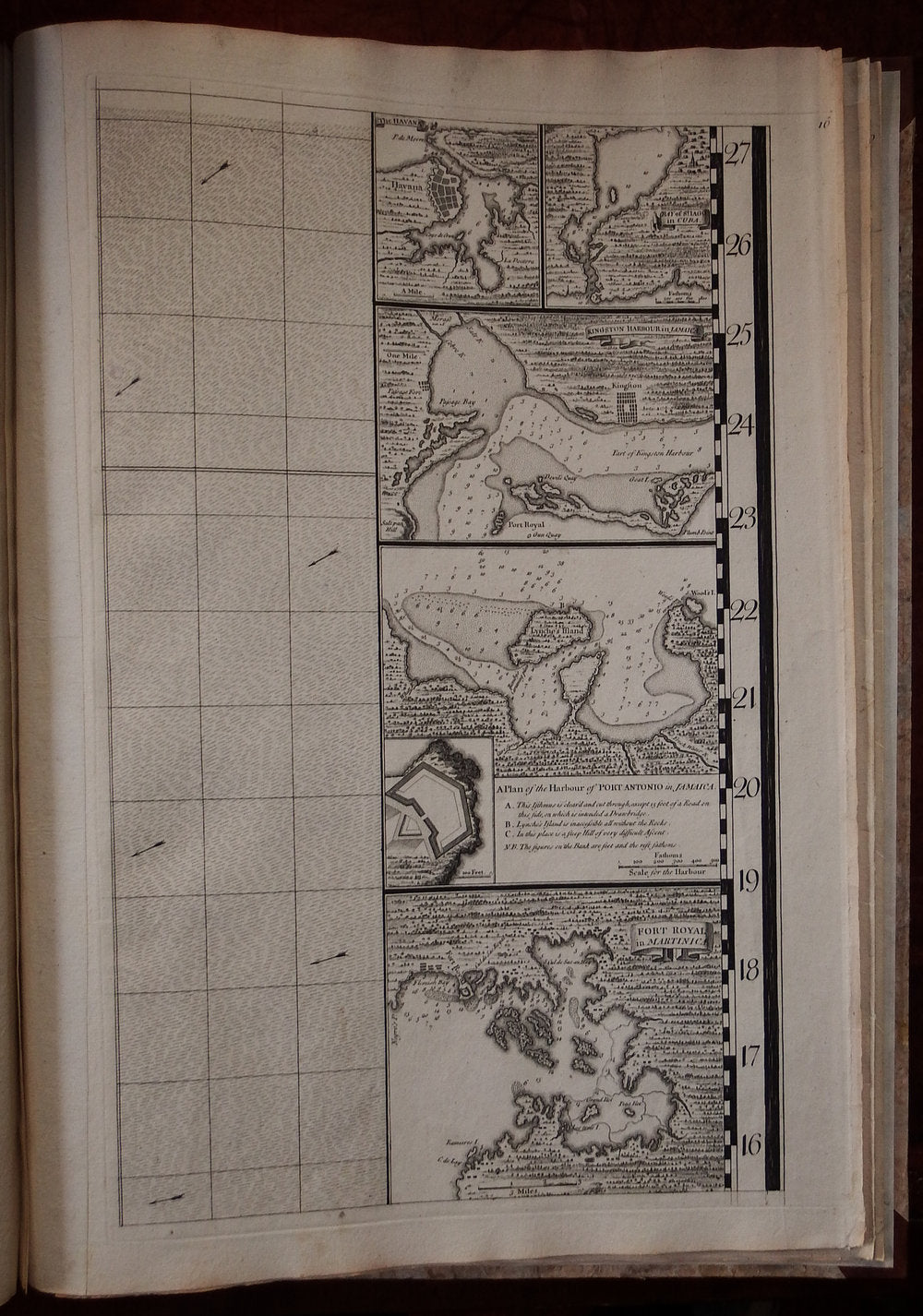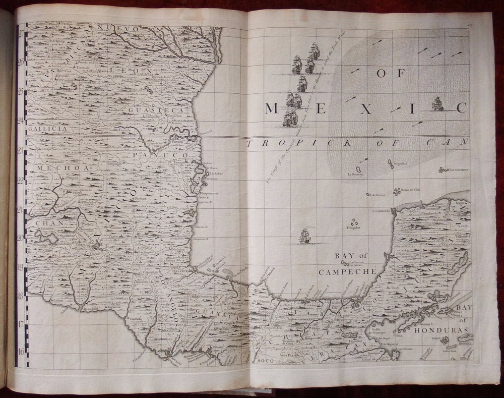 Seventeen detailed charts depict major islands and ports on the American coast and in the Caribbean. Boston, New York and Charleston are included, the latter based on the important inset to Edward Crisp's map of 1711. Numerous legends note historical and topographical features, including the route of Spanish fleet through the Bahama Channel and a vignette depicting the engagement of Sir Charles Wagner against the Spanish off Cartagena.