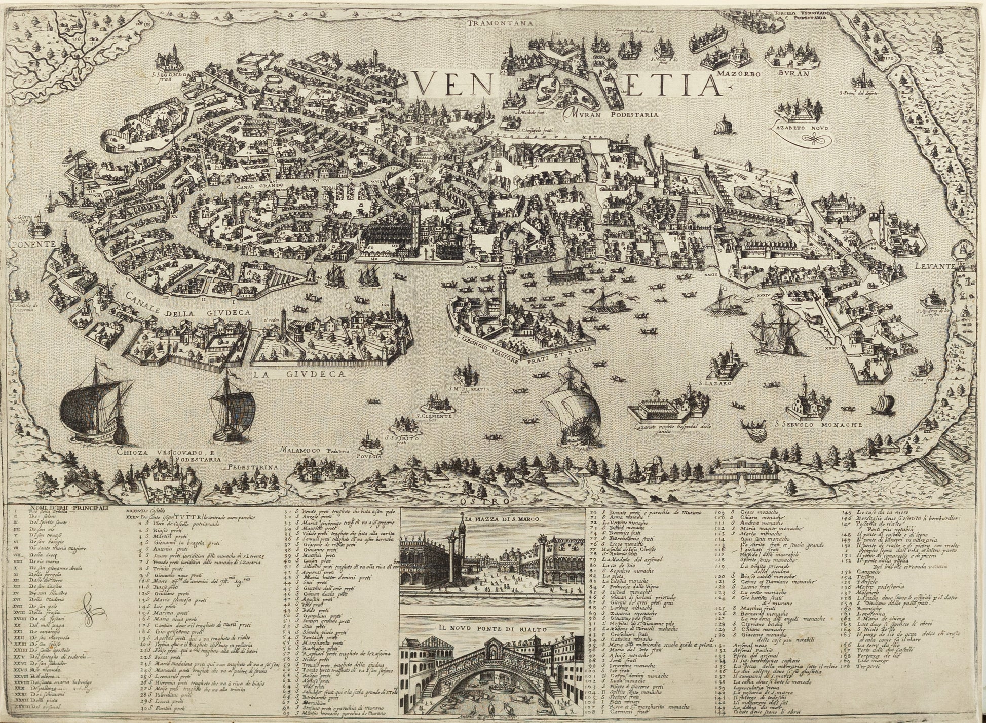 The map is based upon the Bernardo Salvioni (1597) plan of Venice. This gorgeous bird’s-eye view of Venice gives a taste of how this city existed during the seventeenth century. Buildings are shown as well as several traveling vessels including gondolas and ships. Other topographical features are also illustrated.